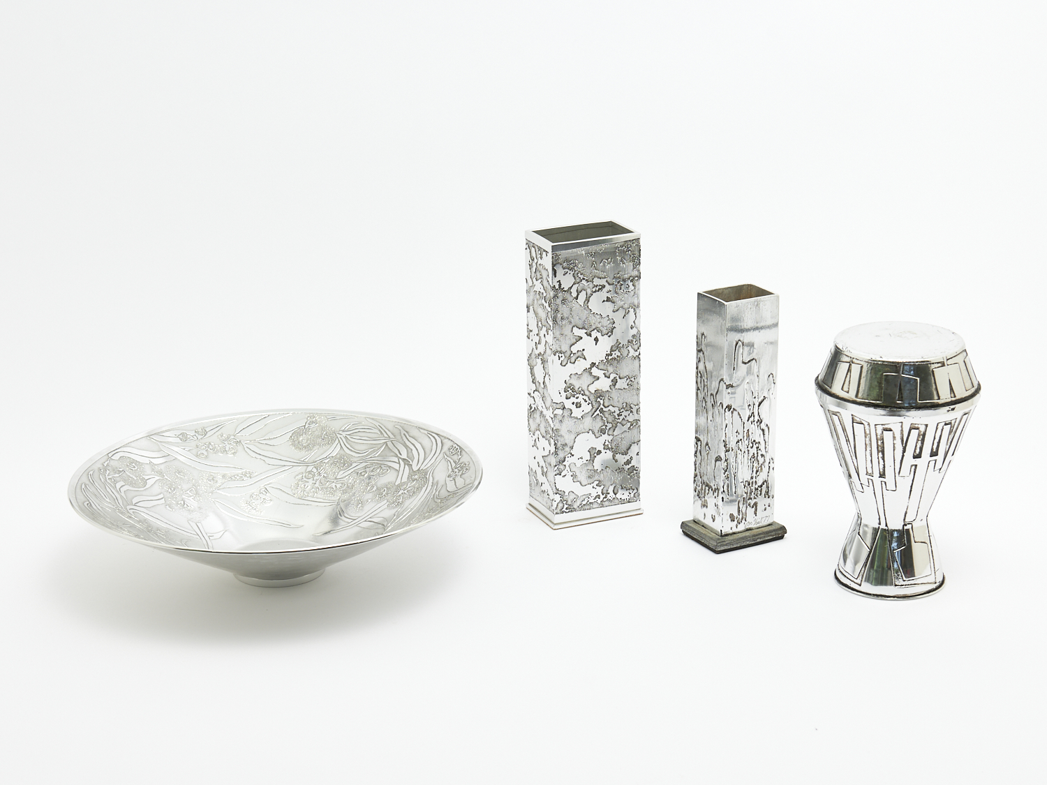 A COLLECTION OF SIGNED AUSTRALIAN DON SHEIL BRUTALIST ALUMINIUM VASES AND BOWLS 23.5CM (TALLEST), LEONARD JOEL LOCAL DELIVERY: MEDIUM