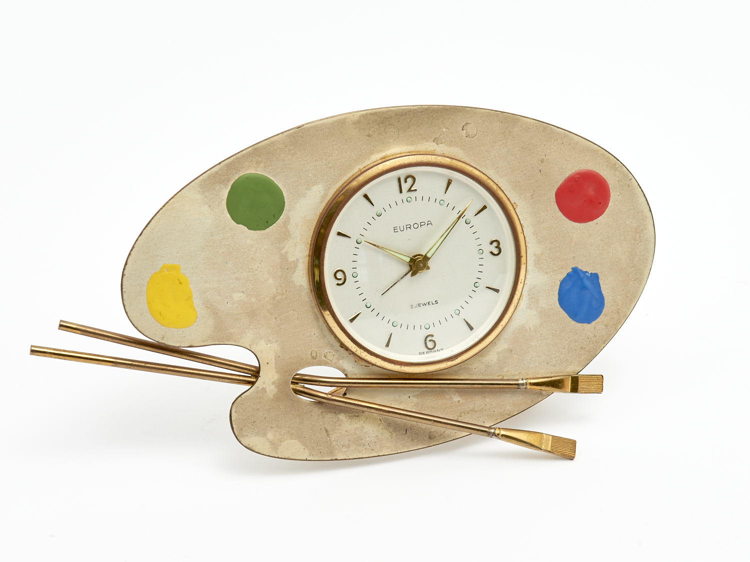 A VINTAGE GERMAN EUROPA ARTIST PALATE DESK CLOCK H.11 X W.19CM, LEONARD JOEL LOCAL DELIVERY: SMALL