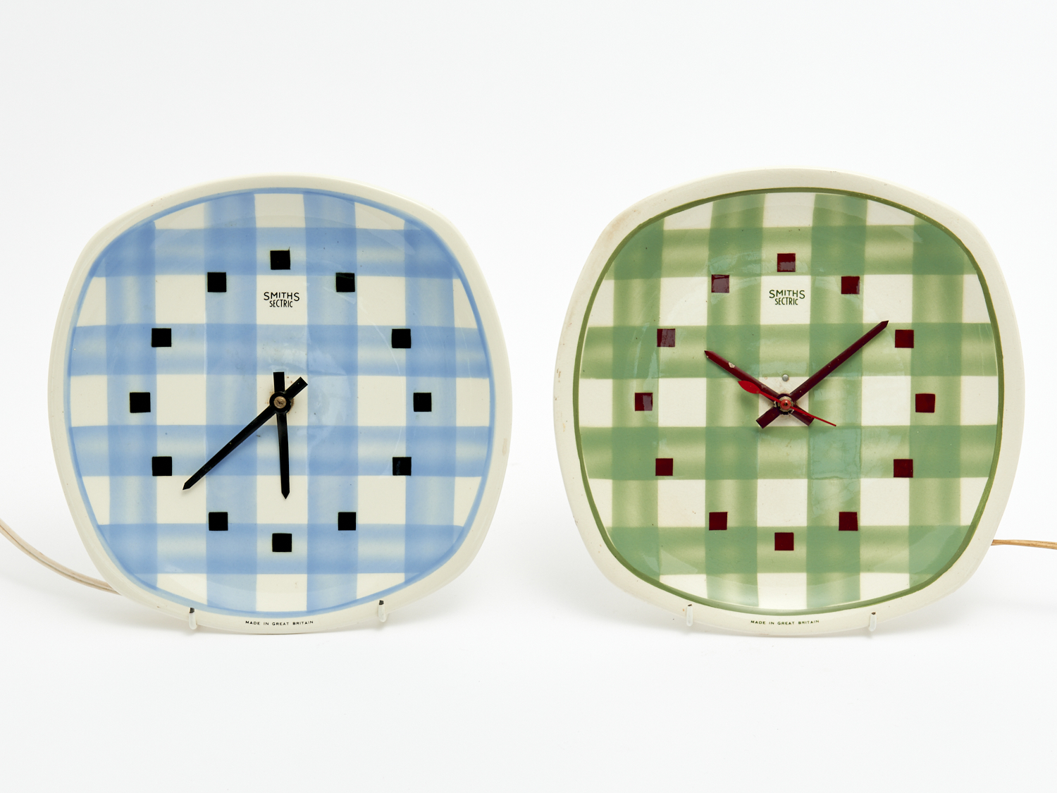 TWO MID CENTURY ENGLISH SMITHS SECTRIC CHEQUERED PATTERN CHINA WALL CLOCKS H.24 X W.23 X D.7CM, LEONARD JOEL LOCAL DELIVERY: MEDIUM