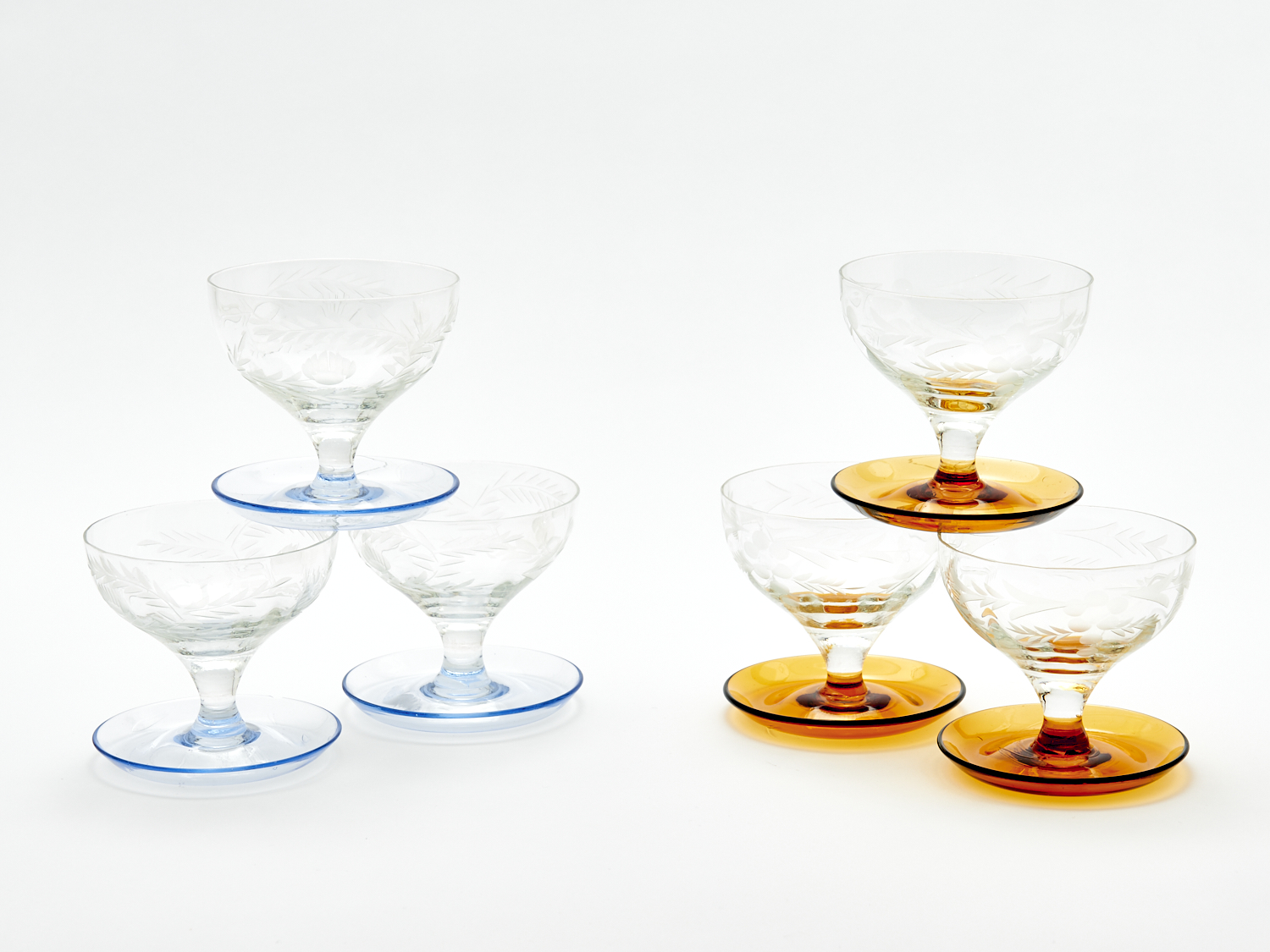 SET OF SIX ENGRAVED TWO-COLOURED FOOTED CHAMPAGNE BOATS H.8.5CM, LEONARD JOEL LOCAL DELIVERY: MEDIUM