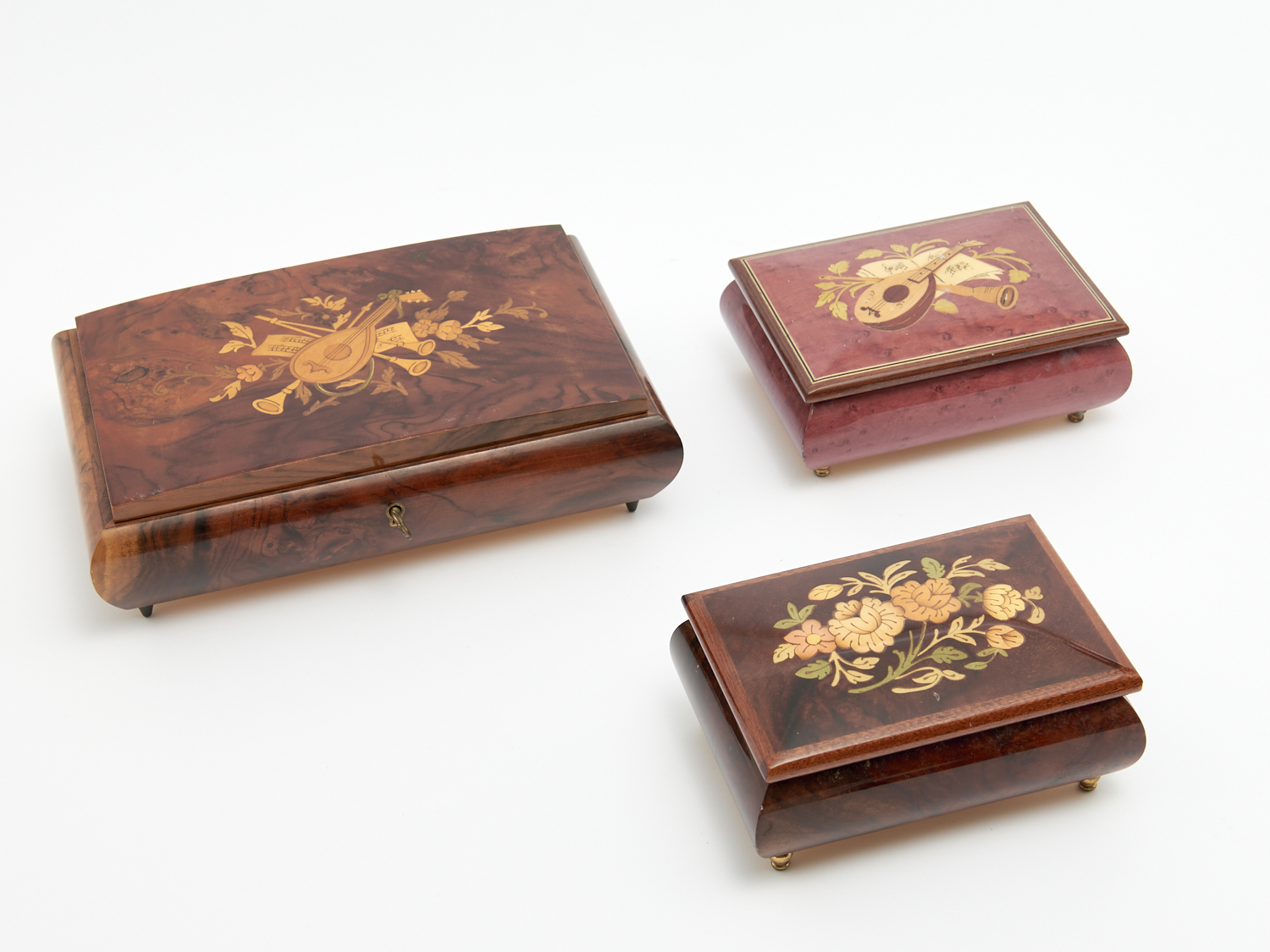 THREE INLAID MUSIC CASKETS H.7.5 X W.24.5 X D.16CM (LARGEST), LEONARD JOEL LOCAL DELIVERY: MEDIUM