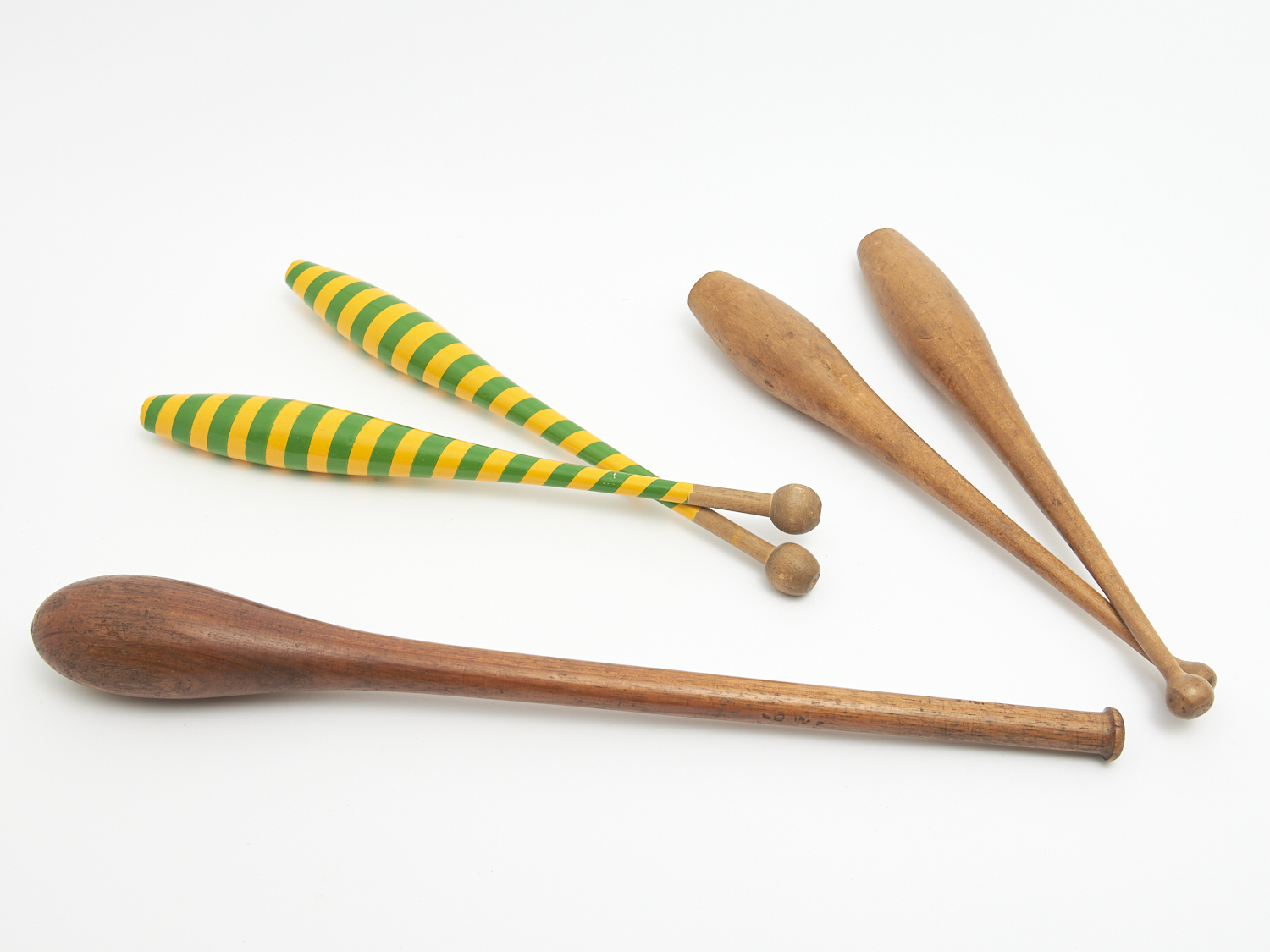 FIVE EARLY 20TH C. AUSTRALIAN BLACKWOOD, PINE AND PAINTED JUGGLING CLUBS L.56CM, LEONARD JOEL LOCAL DELIVERY: SMALL