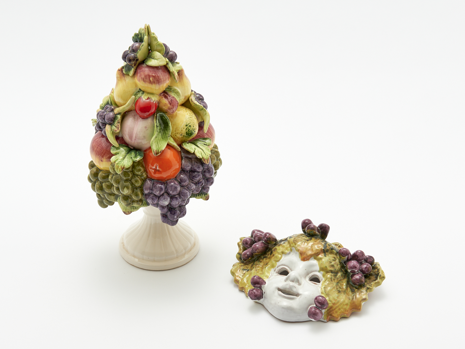 A GLAZED ITALIAN FRUIT PATTERN TREE-FORM CENTREPIECE AND MATCHED FIGURAL WALL MASK H.25CM (CENTREPIECE), LEONARD JOEL LOCAL DELIVERY: SMALL