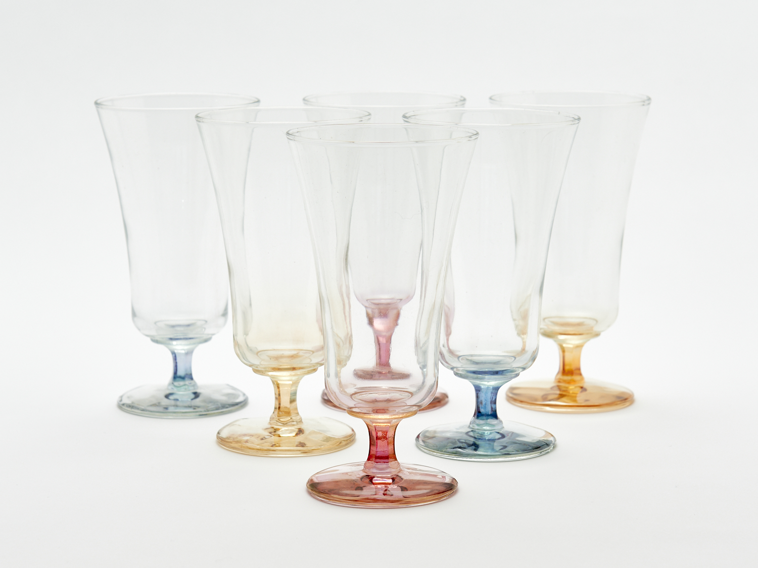 A SET OF SIX HARLEQUIN COLOURED GLASS STEMMED WINE GLASSES H.15CM, LEONARD JOEL LOCAL DELIVERY: MEDIUM