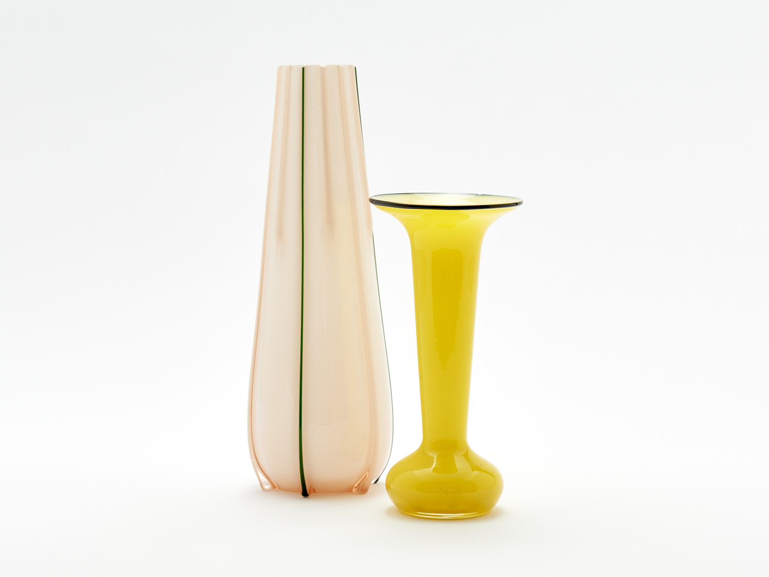 A VINTAGE PINK AND GREEN STRIPE TANGO GLASS VASE AND YELLOW AND BLACK TANGO VASE H.29CM (TALLEST), LEONARD JOEL LOCAL DELIVERY: SMALL