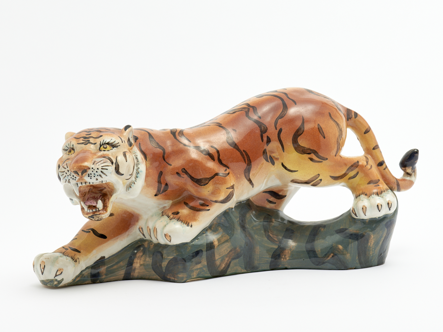 A MID-CENTURY GLAZED PRANCING TIGER FIGURE (A/F) H.21 X L.41CM, LEONARD JOEL LOCAL DELIVERY: SMALL