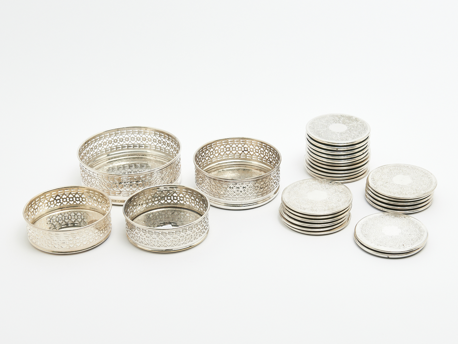 TWO PAIRS OF SILVERPLATED BOTTLE COASTERS AND MATCHED GLASS COASTERS INCLUDING STRACHAN AND OTHERS, LEONARD JOEL LOCAL DELIVERY: SMALL