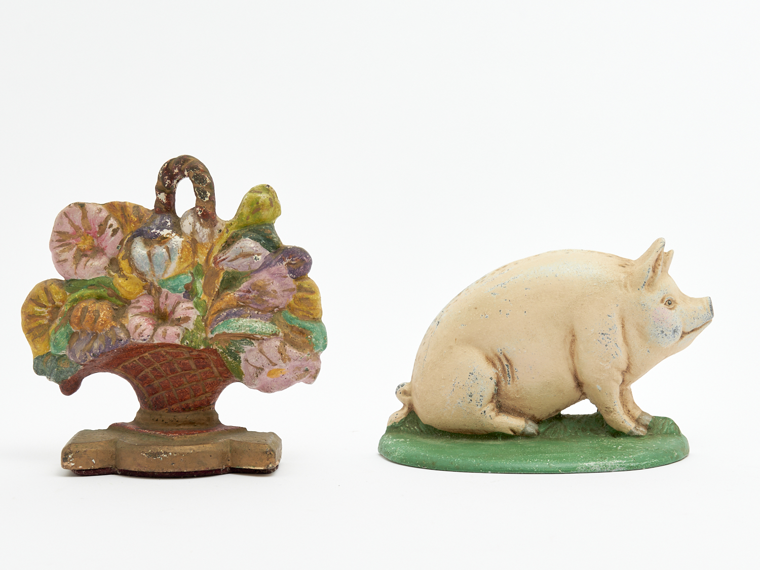 TWO VINTAGE CAST IRON DOOR STOPS INCLUDING A PIG AND BASKET OF FLOWERS, TALLEST H.18CM, LEONARD JOEL LOCAL DELIVERY: SMALL
