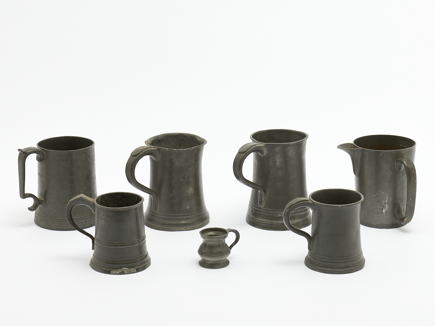 SEVEN ANTIQUE EARLY TO MID 19TH CENTURY PEWTER TAVERN JUGS AND TANKARDS H.13CM (TALLEST), LEONARD JOEL LOCAL DELIVERY: MEDIUM