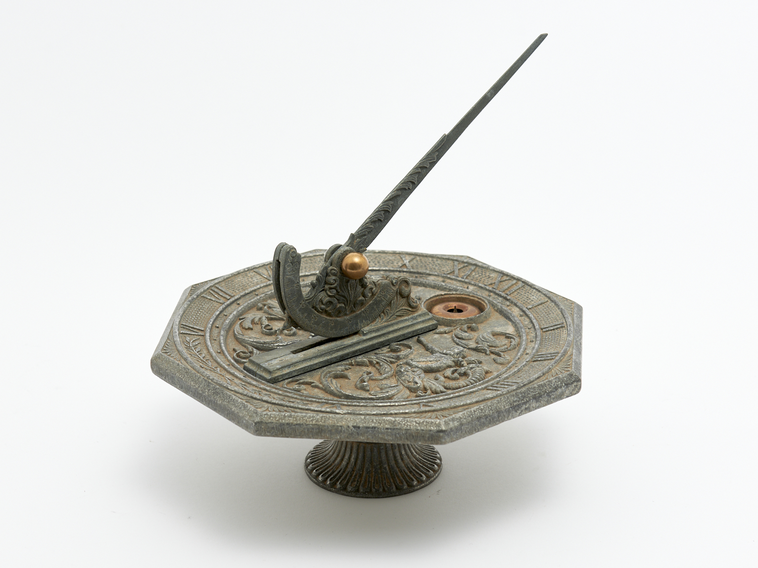A 19TH C. ITALIAN METAL COMPORT FORM SUNDIAL WITH FIGURAL DETAIL DIA.22CM, LEONARD JOEL LOCAL DELIVERY: SMALL