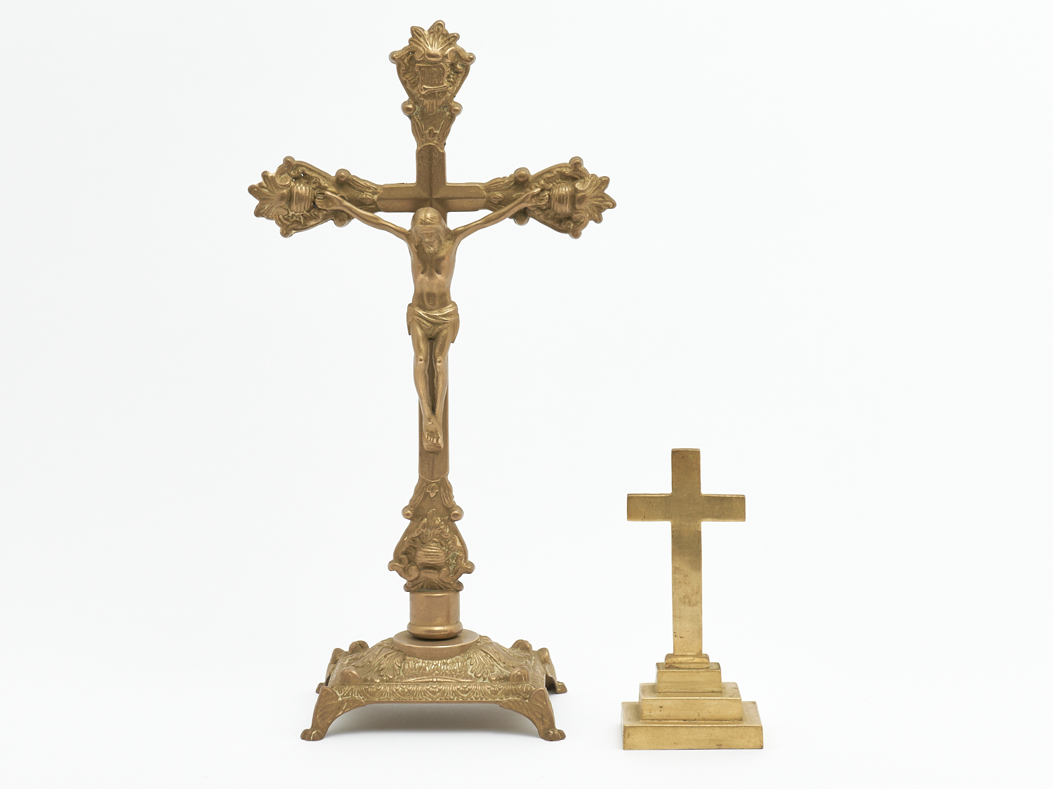 TWO EARLY 20TH CENTURY FRENCH BRASS CROSSES, ONE WITH CORPUS 39.5CM (TALLEST), LEONARD JOEL LOCAL DELIVERY: SMALL