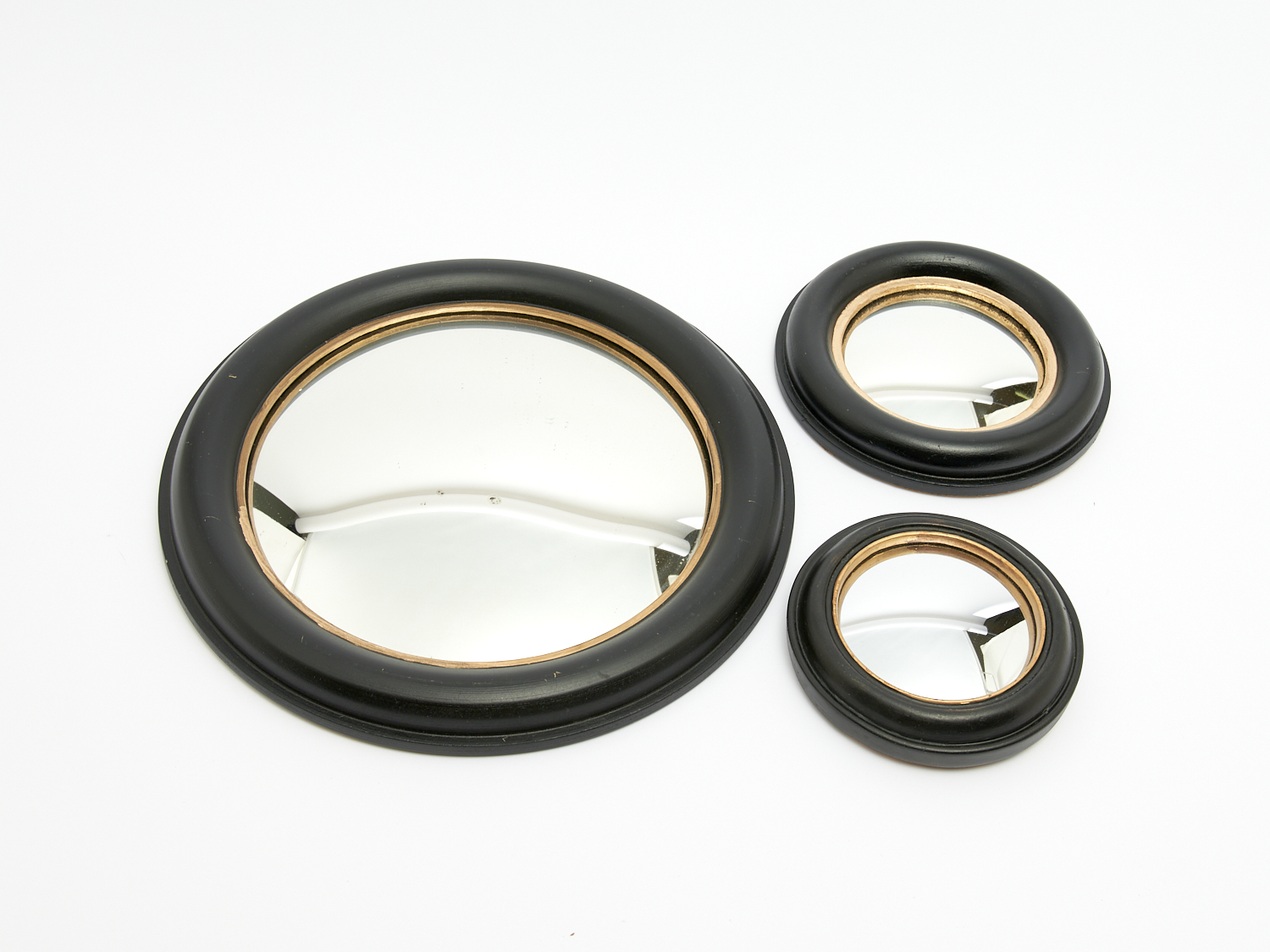 THREE GRADUATED CIRCULAR WOODEN CONVEX MIRRORS WITH GILDED HIGHLIGHTS DIA.32CM (LARGEST), LEONARD JOEL LOCAL DELIVERY: MEDIUM