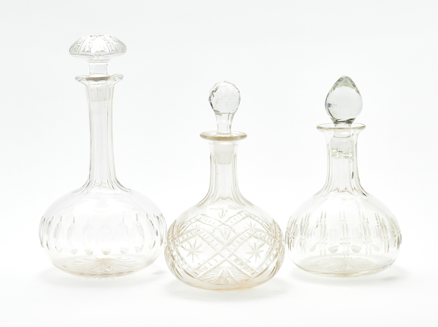 THREE 1920S TO 1940S CRYSTAL DECANTERS (A/F) H.27CM (TALLEST), LEONARD JOEL LOCAL DELIVERY: SMALL