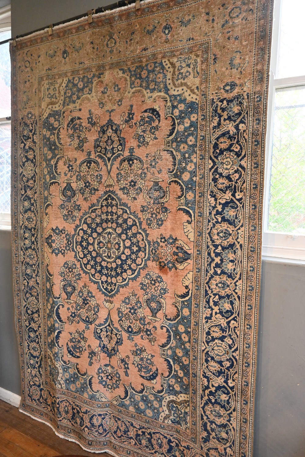 A PERSIAN GALLERY VINTAGE OVERDYE TABRIZ CARPET 100% WOOLEN VINTAGE PILE, DECORATIVE IN SOFT MELLOW TONES OF CORAL GROUND NAVY AND FRENCH BLUE WITH BEIGE HIGH LIGHTS, SIZE: 309 X 201 CM, ORIGIN: PERSIA - RRP: $2,900, DOCUMENTATION OF AUTHENTICITY INCLUDED
