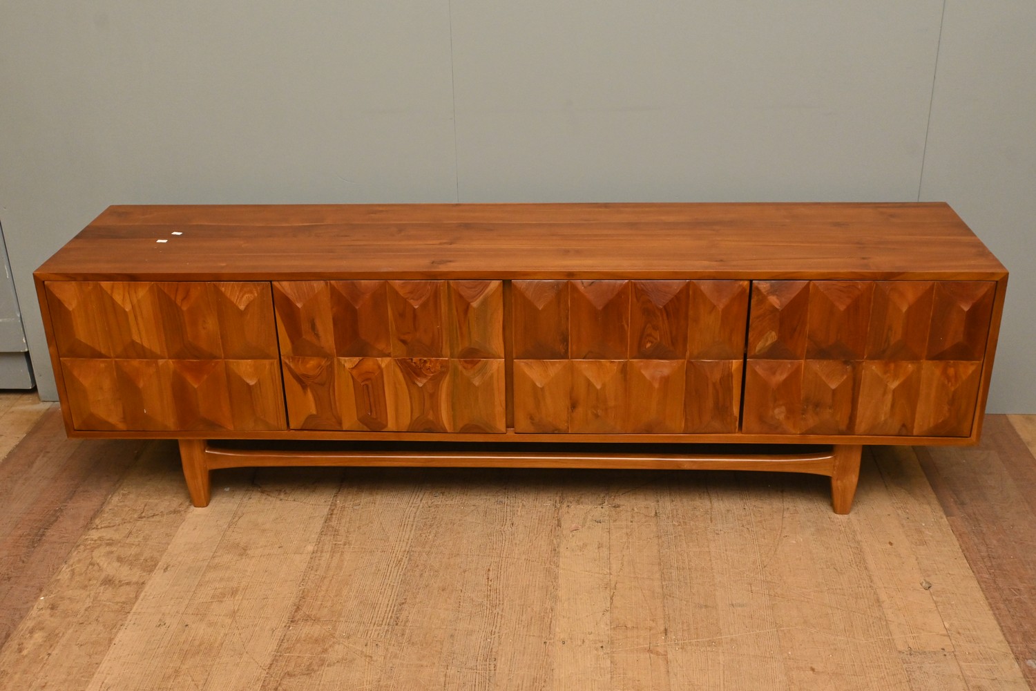 A DIAMOND FRONT TEAK LOW RISE SIDEBOARD (A/F) (59H X 200W X 45D CM) (PLEASE NOTE THIS HEAVY ITEM MUST BE REMOVED BY CARRIERS AT THE CUSTOMER'S EXPENSE. LEONARD JOEL STAFF CANNOT ASSIST CARRYING THIS ITEM) (X-LARGE ITEM)