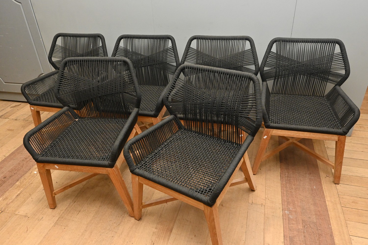 SIX WOVEN CORD AND TEAK DINING CHAIRS (88H X 59W X 65D CM) (LEONARD JOEL DELIVERY SIZE: X-LARGE)