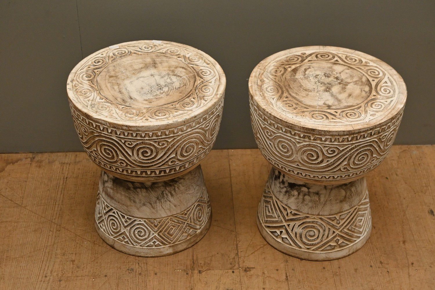 A PAIR OF CARVED TIMBER SIDE TABLES (30H X 40DIA CM) (PLEASE NOTE THIS HEAVY ITEM MUST BE REMOVED BY CARRIERS AT THE CUSTOMER'S EXPENSE. LEONARD JOEL STAFF CANNOT ASSIST CARRYING THIS ITEM) (X-LARGE ITEM)