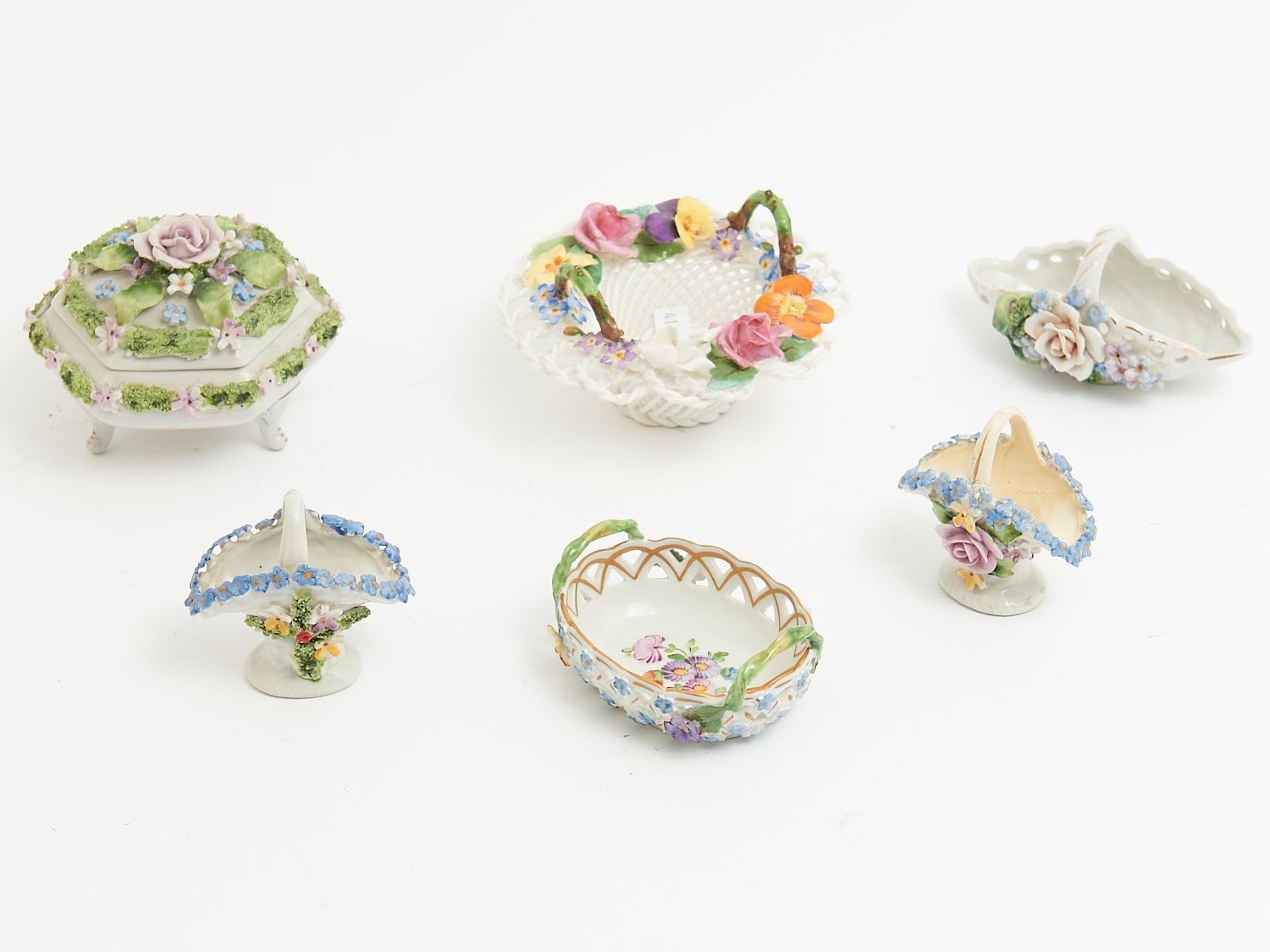 A GROUP OF SMALL PORCELAIN AND CHINA OBJECTS WITH APPLIED FLORAL DECORATION (A/F) W.12.5CM (LARGEST), LEONARD JOEL LOCAL DELIVERY: SMALL