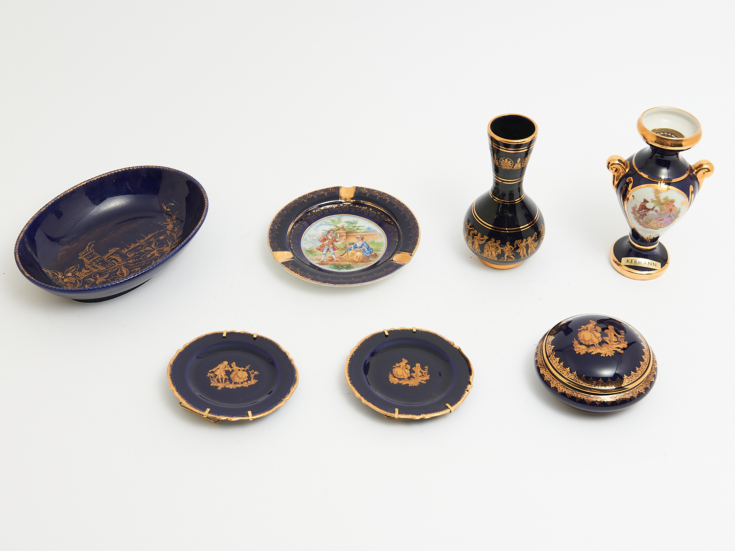 A GROUP OF GILT-DECORATED COBALT-GLAZED VASES, DISHES AND A BOX BY VARIOUS MAKERS H.16.5CM (TALLEST), LEONARD JOEL LOCAL DELIVERY: SMALL