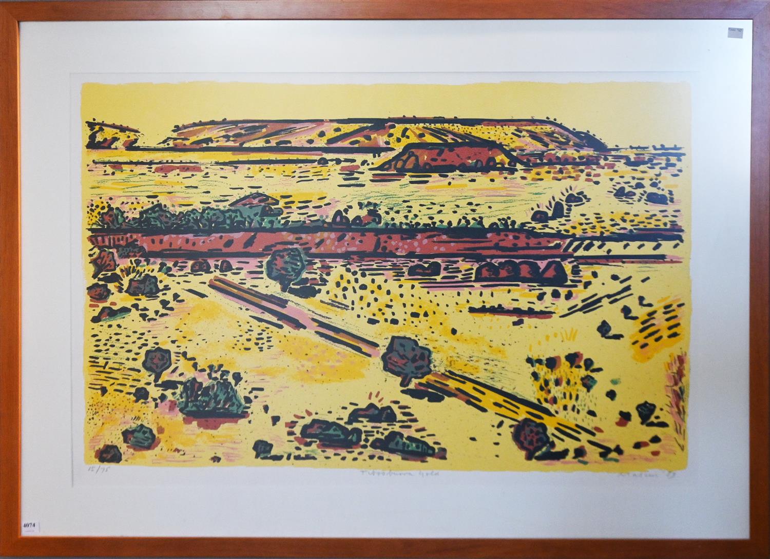 LIN ONUS, GUMBIRRI GARGANINGI 1991, SCREENPRINT ED. 27/85, 49.5 X 74CM, FRAME SIZE: 78 X 101CM PROVENANCE: THE NATIONAL AUSTRALIA...