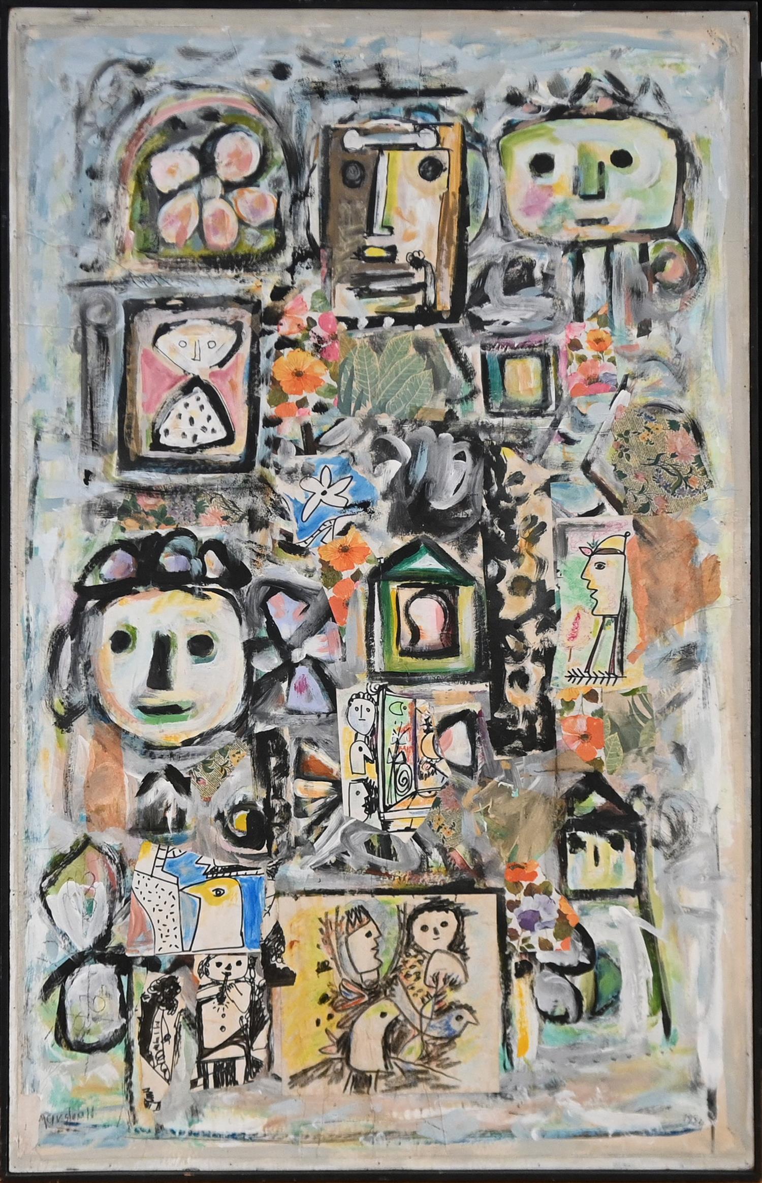 Inherent holes and wear to the board. Visible creases to the paper and lifting of the collage.