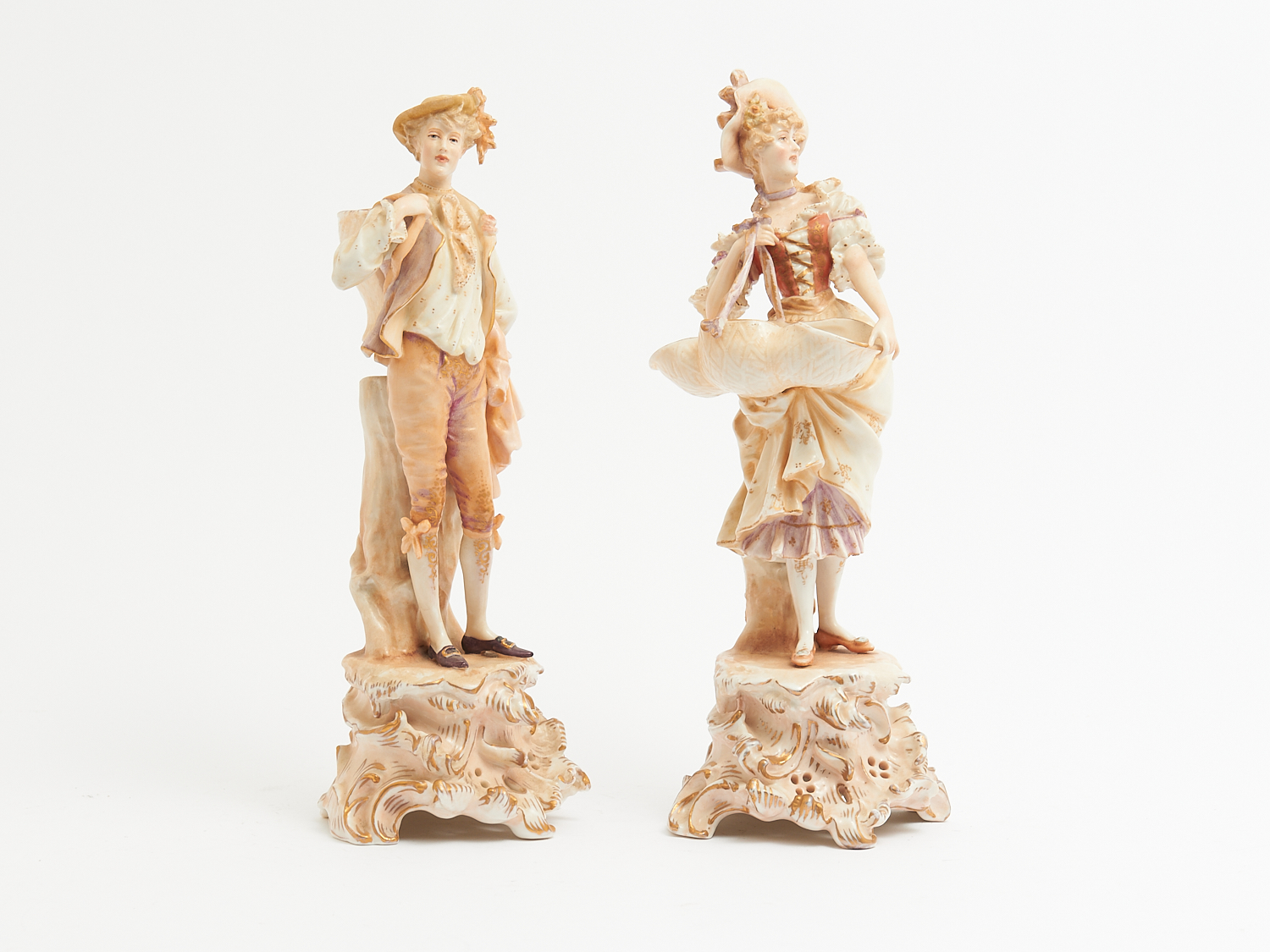 A PAIR OF FIGURES BY SCHIERHOLTZ OF PLAUE (A/F) H.31CM (TALLEST), LEONARD JOEL LOCAL DELIVERY: MEDIUM