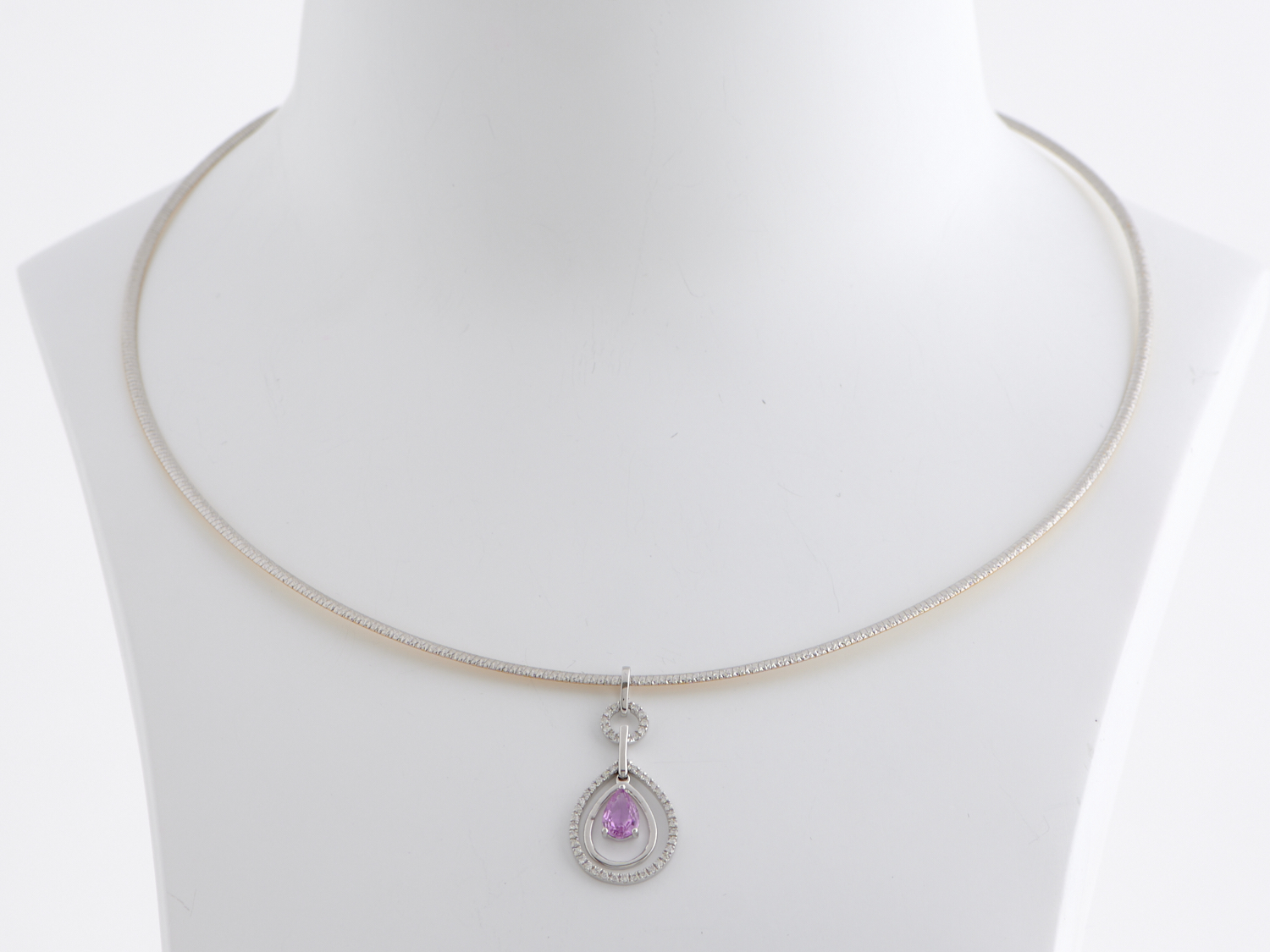 A PINK SAPPHIRE AND DIAMOND PENDANT NECKLACE IN 18CT WHITE GOLD, TO A REVERSIBLE TWO-TONE GOLD OMEGA COLLAR, LENGTH APPROXIMATELY 455MM