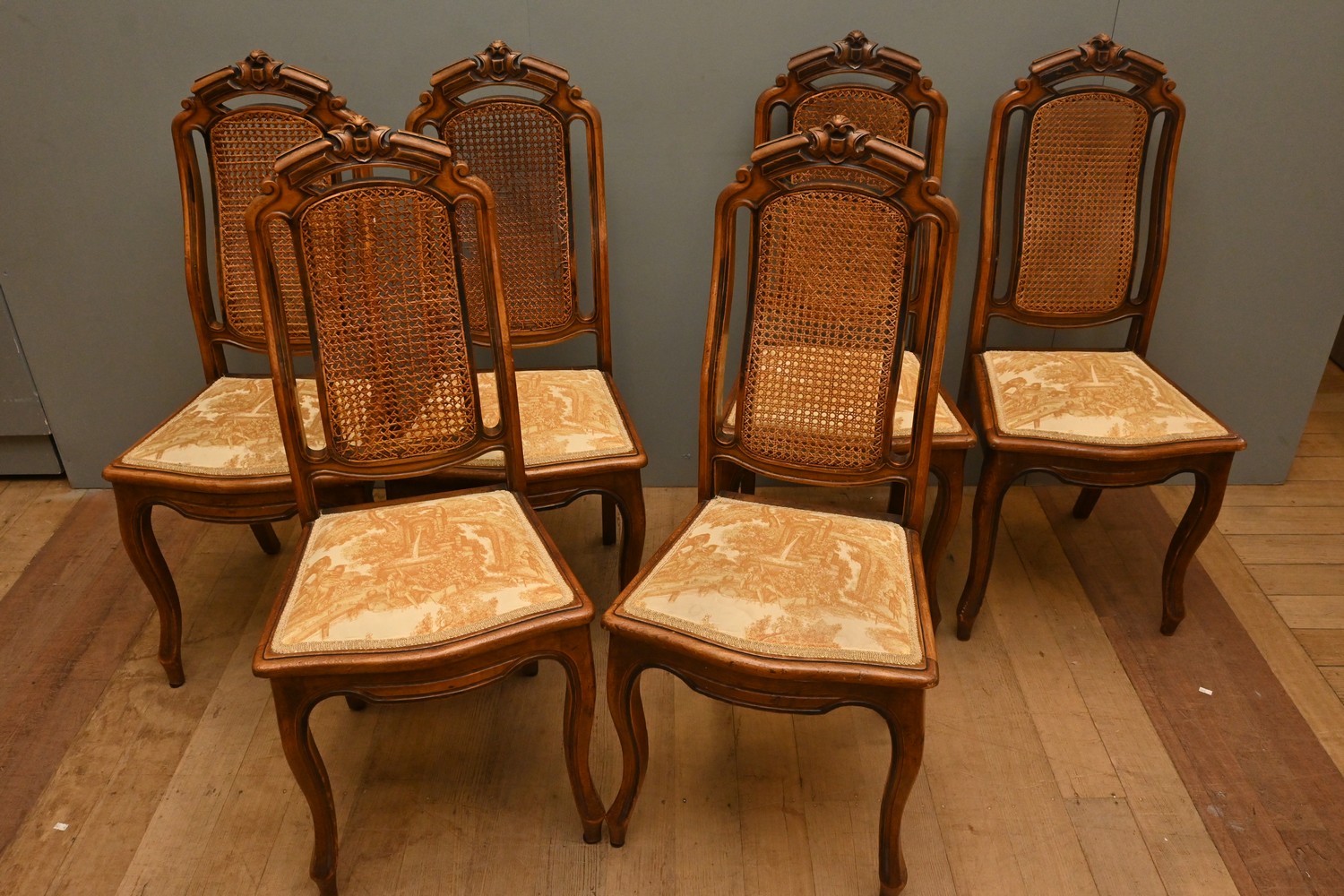 A SET OF SIX LATE 19th CENTURY FRENCH PROVINCIAL BEECH AND CANED SIDE CHAIRS (A/F) (105H X 45W X 45D CM) (LEONARD JOEL DELIVERY SIZE: X-LARGE)