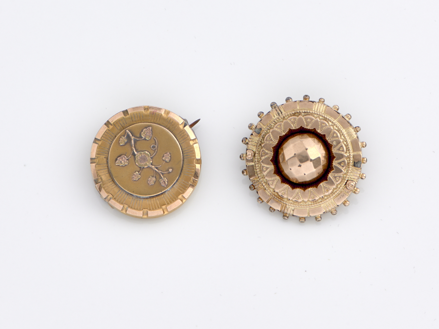 TWO VICTORIAN TARGET BROOCHES, ONE WITH CASE IN 18CT GOLD AND ONE IN GOLD PLATE