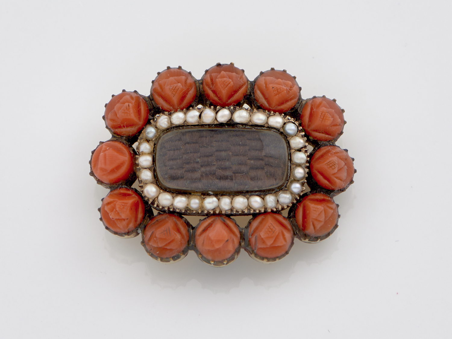 A GEORGIAN CORAL AND SEED PEARL MOURNING BROOCH IN GOLD PLATE, MEASURING 35 X 25MM