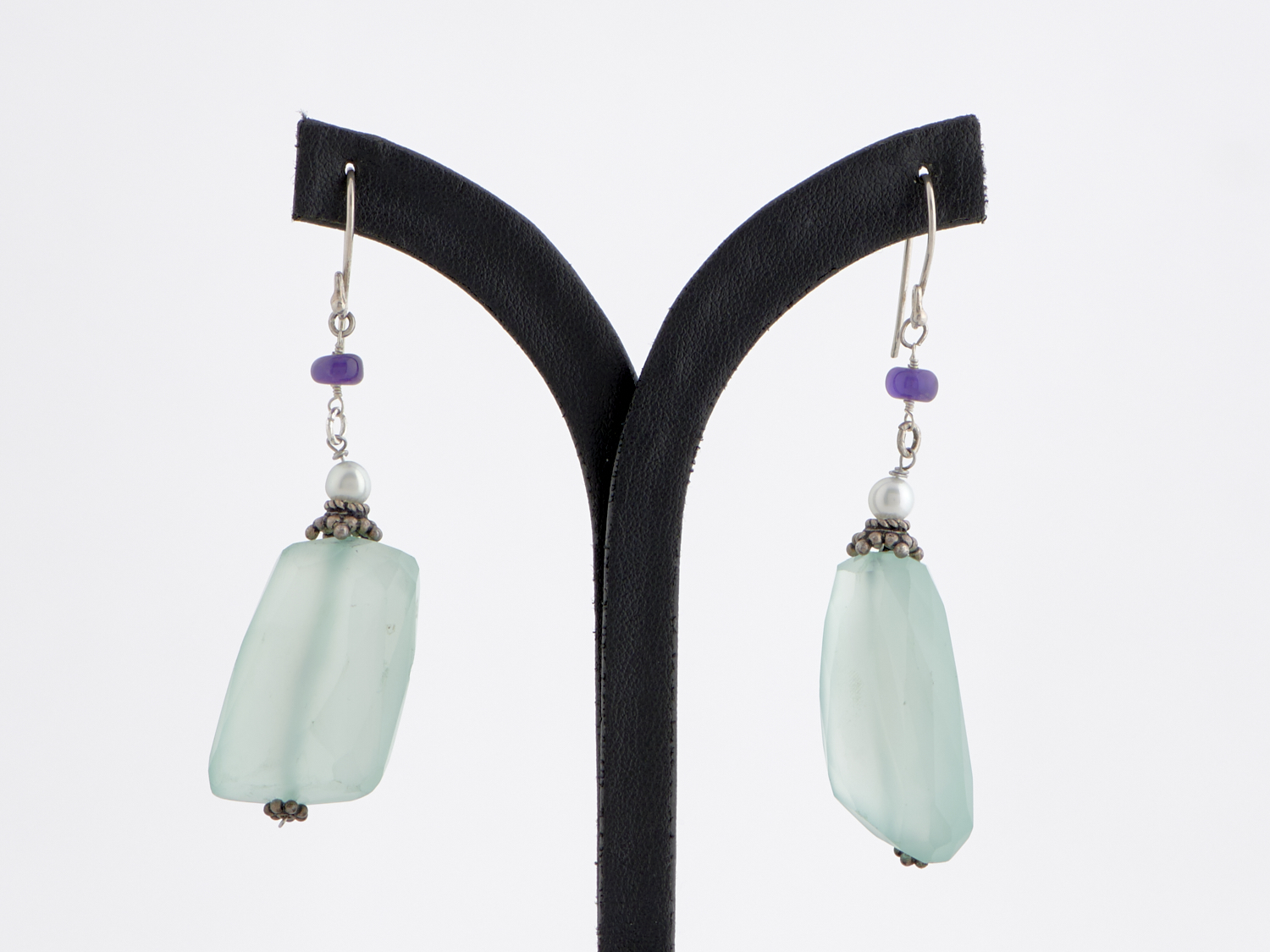 A PAIR OF GREEN STONE, AMETHYST AND PEARL EARRINGS, IN SILVER, TO SHEPHERD HOOK FITTINGS, LENGTH 65MM