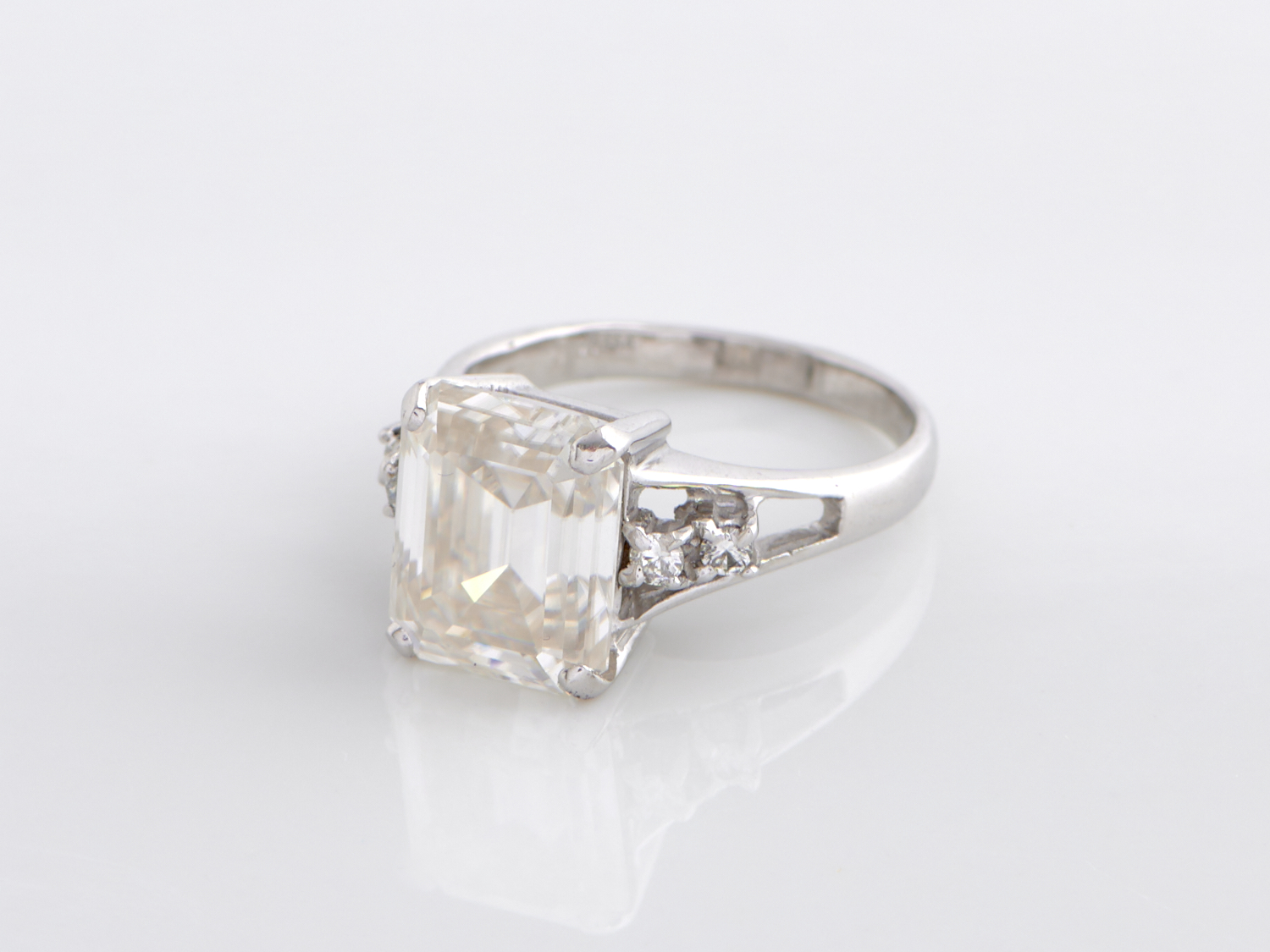 A MOISSANITE AND DIAMOND RINGS IN 18CT WHITE GOLD, THE MOISSANITE WEIGHING 5.05CTS, THE DIAMONDS TOTALLING 0.12CTS, RING SIZE M, ACCOMPANIED BY VALUATION