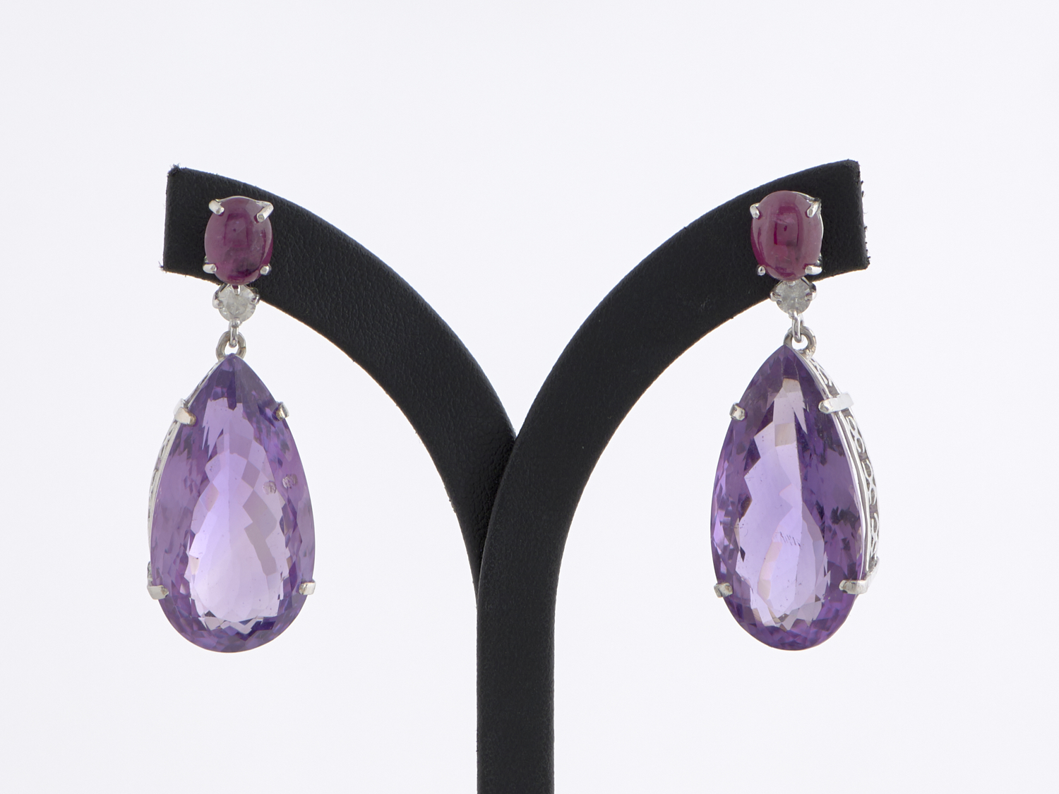 A PAIR OF AMETHYST AND RUBY EARRINGS IN 18CT WHITE GOLD, THE AMETHYST TOTALLING 65.08CTS, WITH RUBIES TOTALLING 5.55CTS, TO POST AND BUTTERFLY FITTINGS, LENGTH 40MM