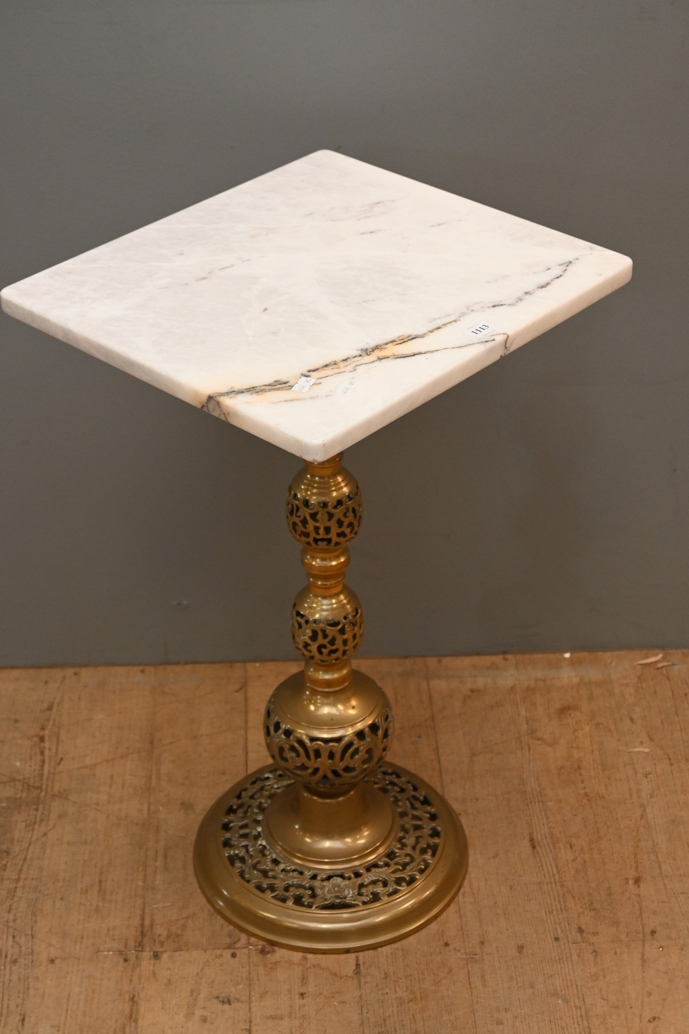 A VINTAGE PIERCED BRASS BASED MARBLE TOPPED SIDE TABLE (68H X 40W X 37D CM) (LEONARD JOEL DELIVERY SIZE: LARGE)