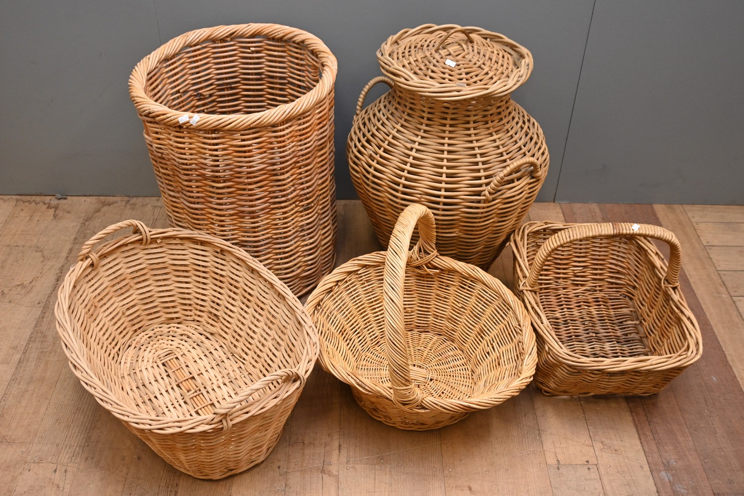 A LARGE COLLECTION OF VINTAGE WOVEN CANE BASKETS (A/F) (65H X 50DIA CM) (LEONARD JOEL DELIVERY SIZE: LARGE)