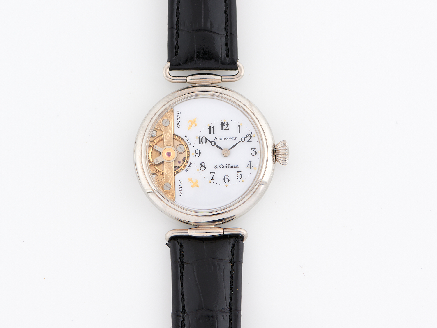 S. COIFMAN HEBDOMAS, SWISS, EIGHT DAY WRIST WATCH TO A LEATHER BAND WITH FOLDING CLASP, FEATURING VERTICAL MANUAL WINDING MOVEMENT WHITE DIAL WITH EXPOSED BALANCE WHEEL DIAMETER APPOXIMATELY 40MM, ACCOMPANIED BY LEATHER DISPLAY BOX