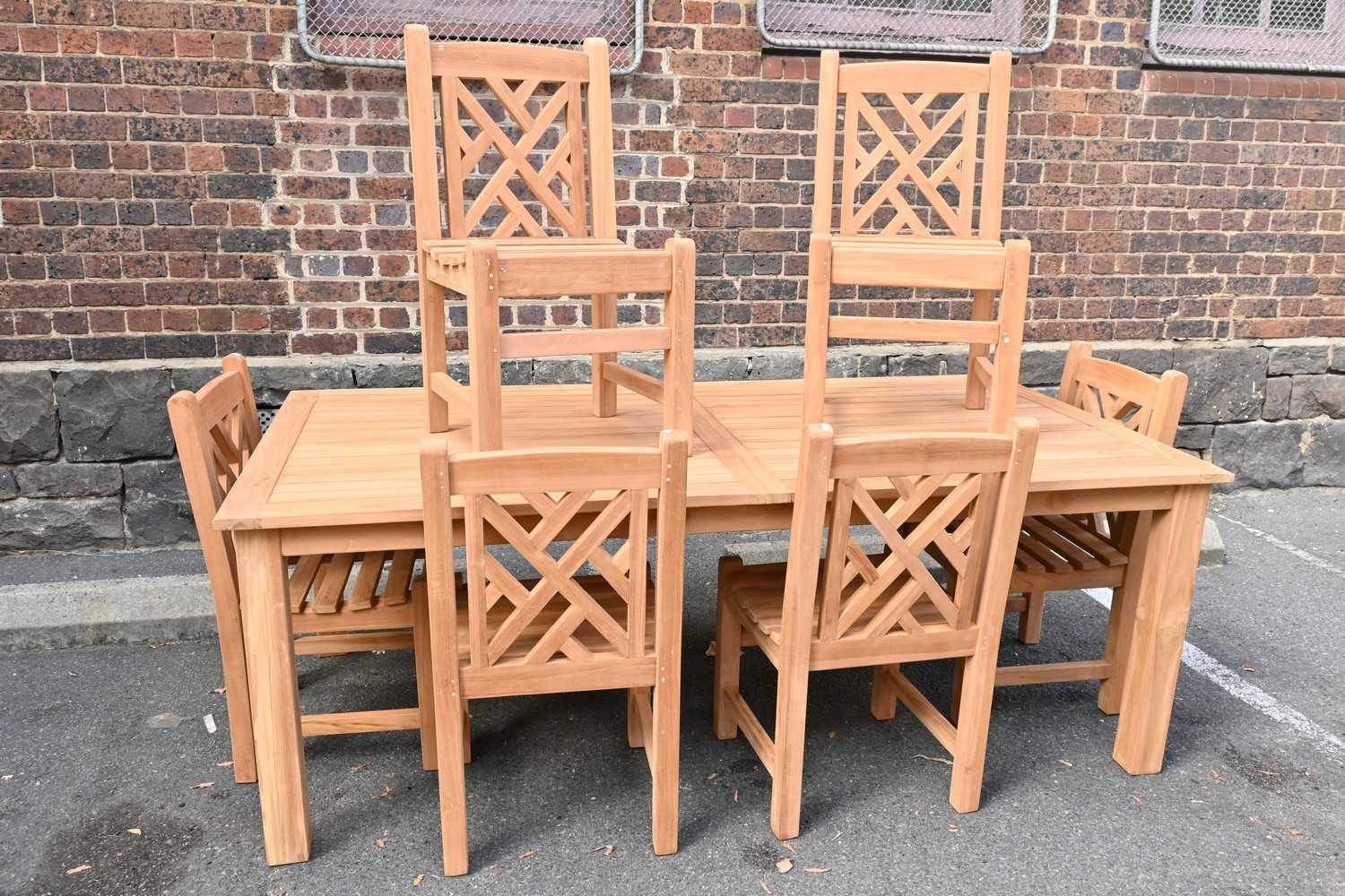A SEVEN PIECE TEAK DINING SETTING (77H X 210W X 110D CM) (PLEASE NOTE THIS HEAVY ITEM MUST BE REMOVED BY CARRIERS AT THE CUSTOMER'S EXPENSE. LEONARD JOEL STAFF CANNOT ASSIST CARRYING THIS ITEM) (X-LARGE ITEM)