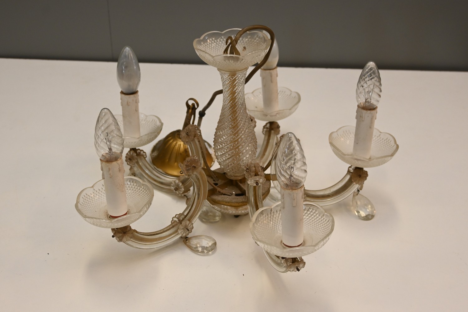 A FIVE BRANCH GLASS CHANDELIER (A/F) (70H X 45DIA CM) (LEONARD JOEL DELIVERY SIZE: LARGE)