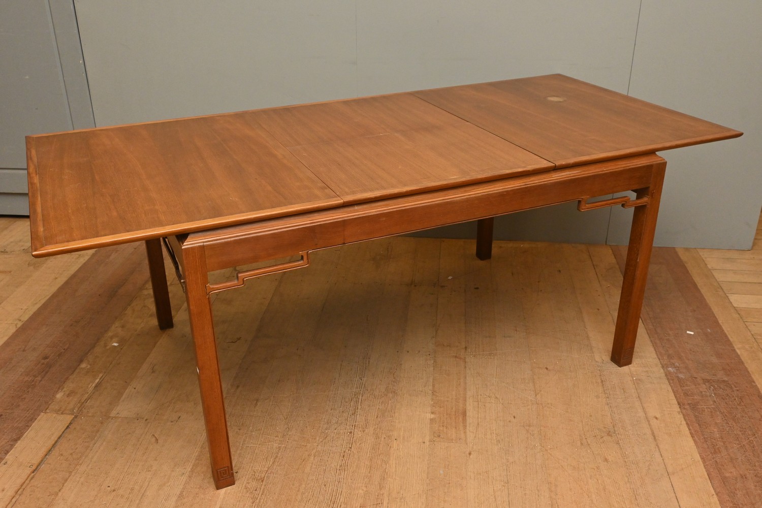 A RETRO CHINESE STYLE BLACKBEAN EXTENSION DINING TABLE BY DECRO (A/F) (75H X 200 EXTENDED WIDTH X 140 UNEXTENDED WIDTH X 91D CM) (PLEASE NOTE THIS HEAVY ITEM MUST BE REMOVED BY CARRIERS AT THE CUSTOMER'S EXPENSE. LEONARD JOEL STAFF CANNOT ASSIST CARRYING THIS ITEM) (X-LARGE ITEM)