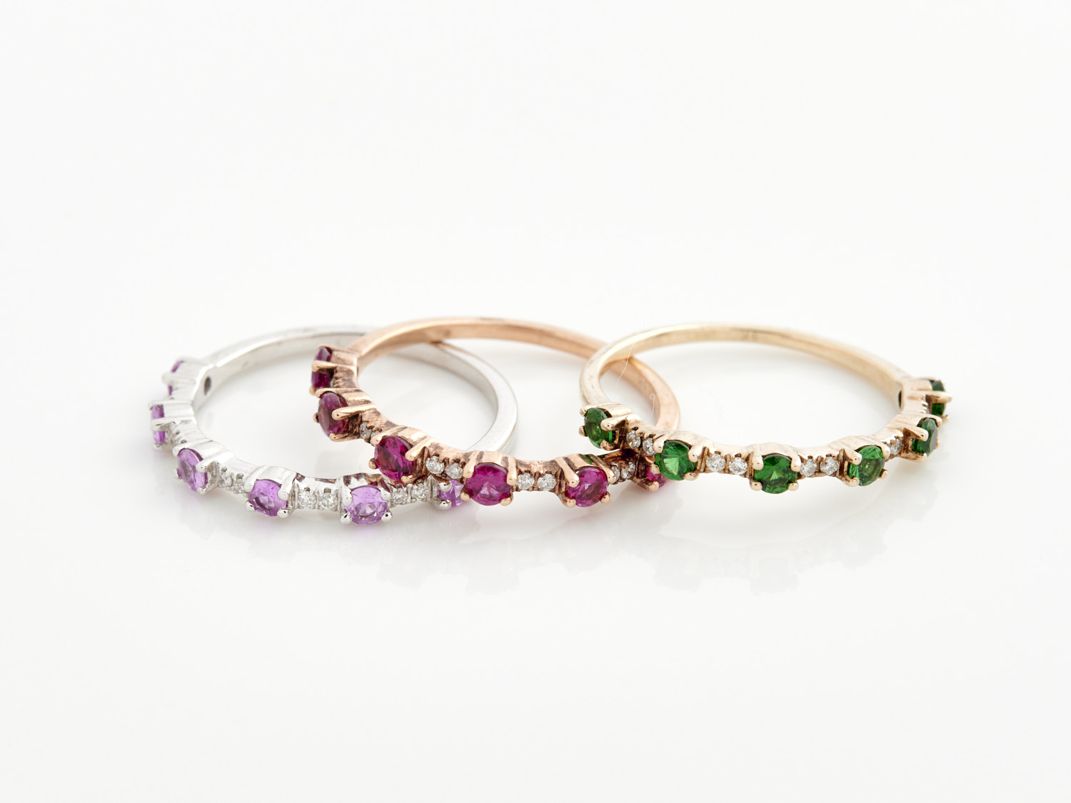 A SET OF THREE STACKING RINGS IN 9CT TRI COLOUR GOLD, INCLUDING PINK SAPPHIRE, PINK TOURMALINE, TSAVORITE GARNETS AND DIAMOND, SIZE N1/2