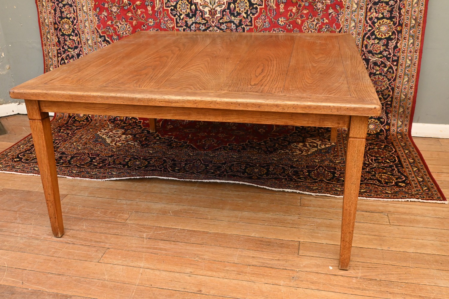 A SQUARE OAK DINING TABLE (74H X 150W X 150D CM) (PLEASE NOTE THIS HEAVY ITEM MUST BE REMOVED BY CARRIERS AT THE CUSTOMER'S EXPENSE. LEONARD JOEL STAFF CANNOT ASSIST CARRYING THIS ITEM) (X-LARGE ITEM)