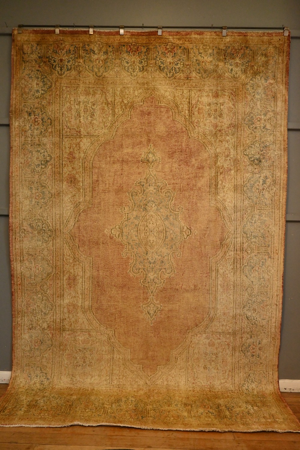 A UNIQUE FINE MODERN OVER-DYED VINTAGE PERSIAN KERMAN CARPET. CREATED FROM A FINELY HAND-KNOTTED VINTAGE MEDALLION DESIGN PERSIAN KERMAN CARPET, HAND KNOTTED USING HAND SPUN WOOL ON STRONG COTTON WARPS. THE RUG IS OVER-DYED IN GOLD, CHAMPAGNE, WITH SEA GREEN AND SLIGHT ROSE TONES. EX-GALLERY EXHIBITED CARPET. SIZE: 368 X 245 CM- ORIGIN: PERSIA - RRP: $5,900. DOCUMENTATION OF AUTHENTICITY INCLUDED