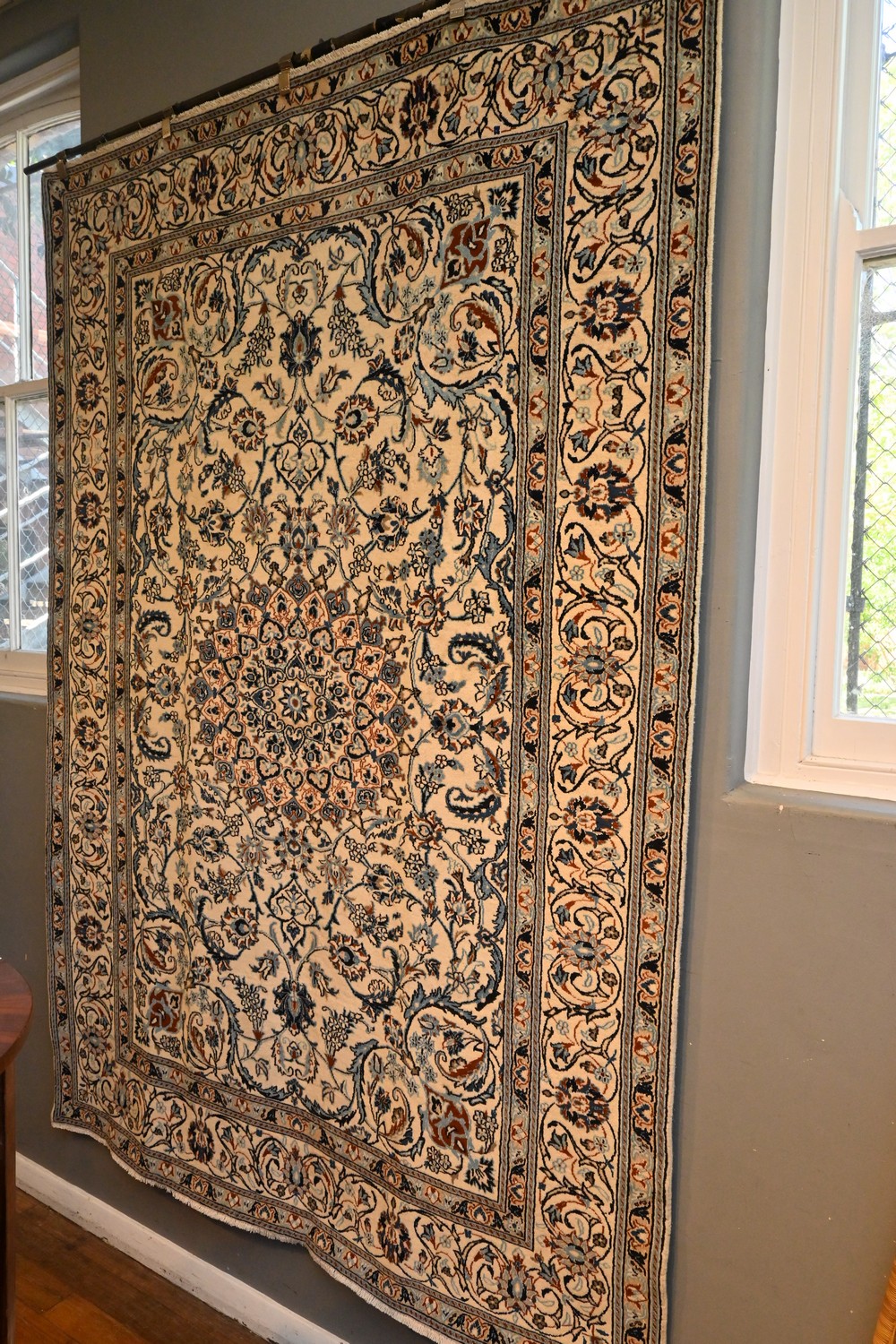A FABULOUS EX GALLERY, HAND-KNOTTED PERSIAN NAIEN CARPET FROM THE KHORASAN REGION. 100% FINE LAMB'S WOOL PILE INTER KNOTTED WITH SILK HIGHLIGHTS. CLASSIC NAIEN DESIGN OF CENTRAL SUNBURST 16 LOBED MEDALLION AND QUARTERED CORNER MEDALLIONS IN A CREAM FIELD OF PALMETTES, FLORAL SPRAYS AND ARABESQUE SCROLLS. IN TONES OF COGNAC, FRENCH BLUE AND IVORY. BORDER OF PALMETTES & FLORAL SPRAYS. SIZE: 295 X 204 CM. ORIGIN: PERSIA - RRP: $4,900. DOCUMENTATION OF AUTHENTICITY INCLUDED