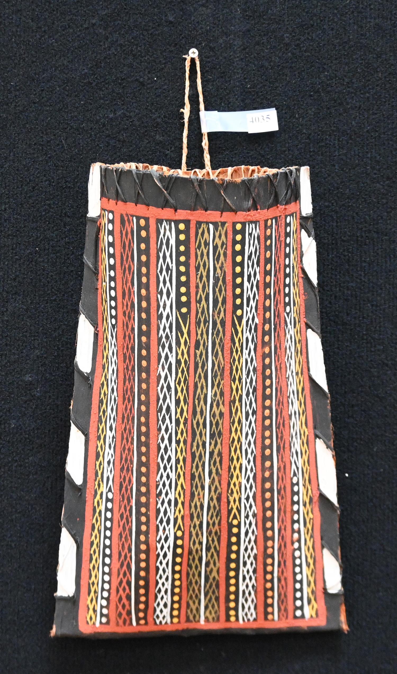 In stable condition. Light wear to the pigment and inherent splits to the bark. The hanging string is sufficiently worn and close to breaking.