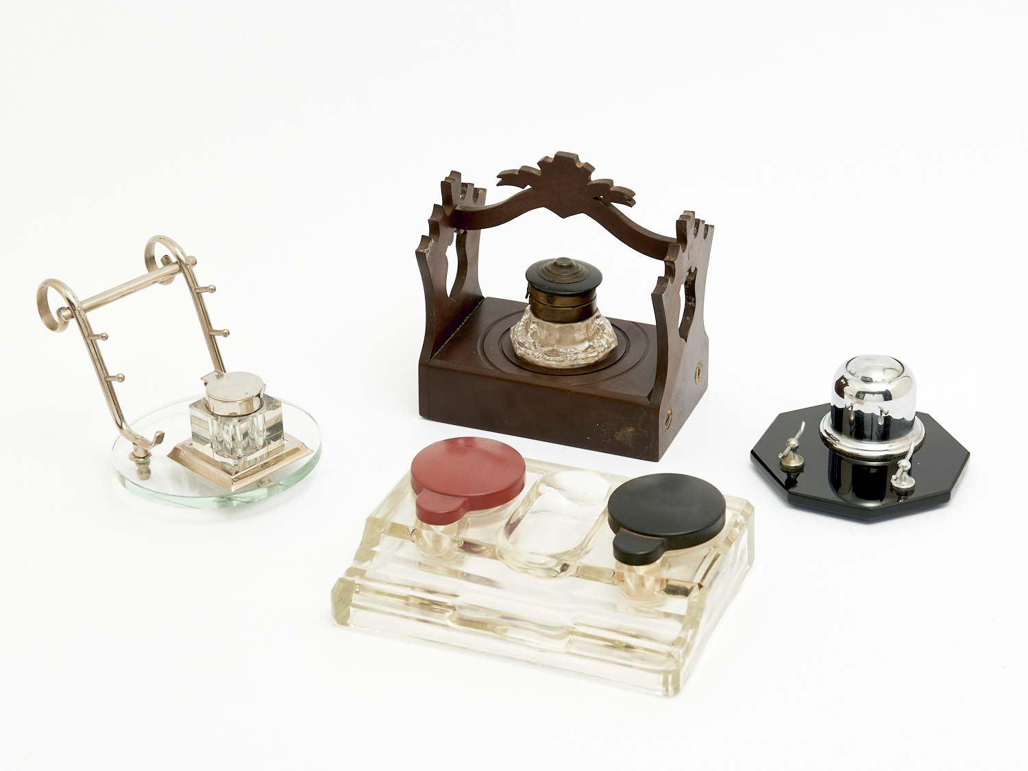 A COLLECTION OF VICTORIAN AND EDWARDIAN SILVER PLATE CHROME AND GLASS INKWELL DESK SETS W.17.5CM (WIDEST), LEONARD JOEL LOCAL DELIVERY: SMALL