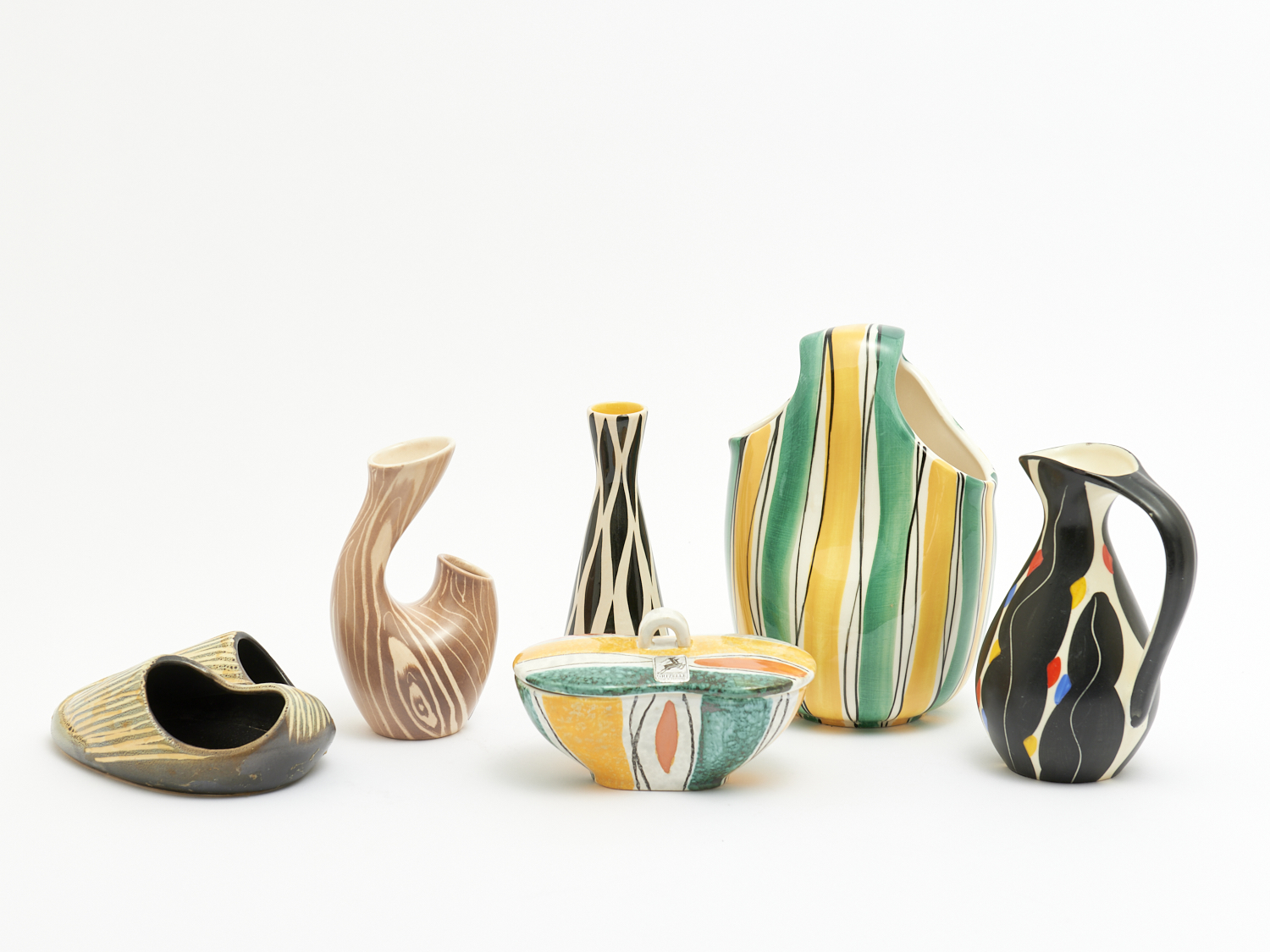 SIX RETRO ITALIAN AND GERMAN HAND PAINTED POTTERY VASES AND DISHES H.21CM (TALLEST), LEONARD JOEL LOCAL DELIVERY: MEDIUM