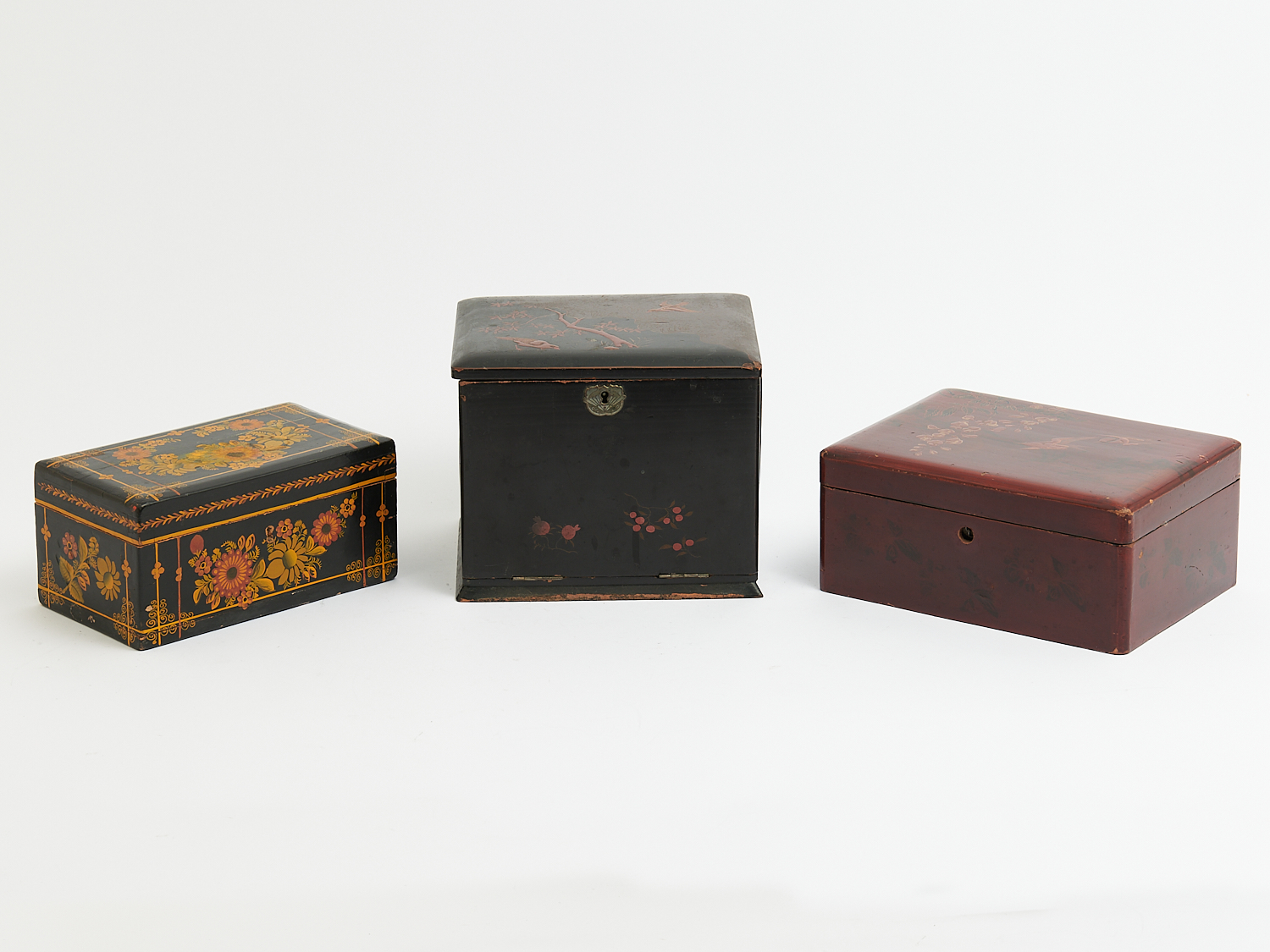 THREE ANTIQUE LACQUERED WOODEN BOXES 15.5CM (TALLEST), LEONARD JOEL LOCAL DELIVERY: MEDIUM