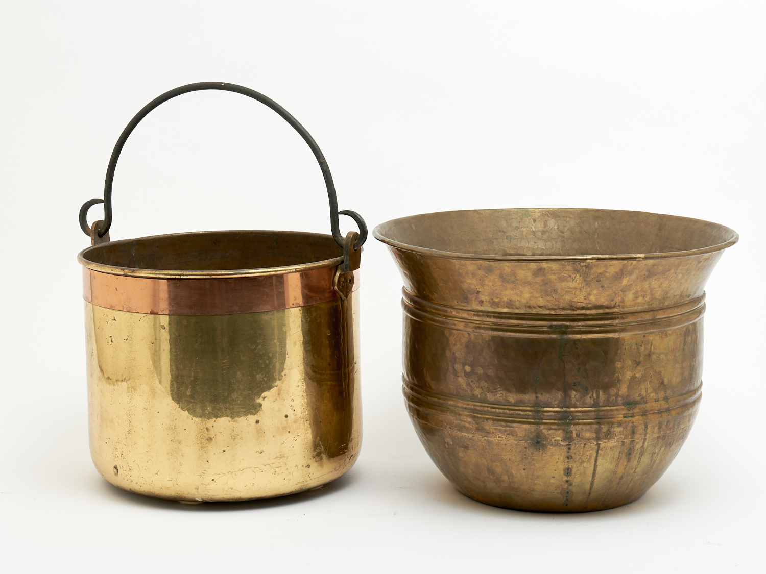 A FRENCH SOLID BRASS AND COPPER HANDLED BUCKET AND A BRASS PLANTER H.27CM (PLANTER) LEONARD JOEL LOCAL DELIVERY: MEDIUM