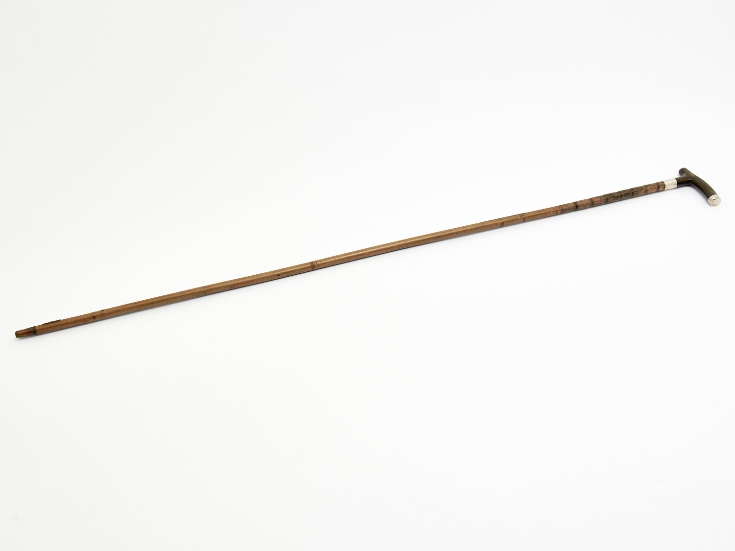 A STERLING SILVER MOUNTED HORN HANDLED AND CANE SHAFT WALKING STICK (A/F) H.88.5CM, LEONARD JOEL LOCAL DELIVERY: MEDIUM
