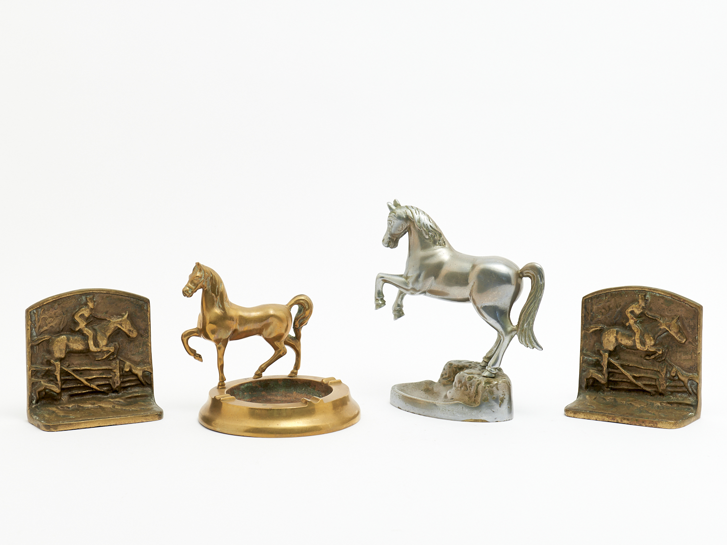 FOUR HORSE THEMED ITEMS INCLUDING A PAIR OF 1920S ENGLISH SOLID BRASS HORSE DECORATED BOOKENDS, A REARING HORSE SCULPTURE AND A BRASS ASHTRAY H.19.5CM (TALLEST), LEONARD JOEL LOCAL DELIVERY: MEDIUM